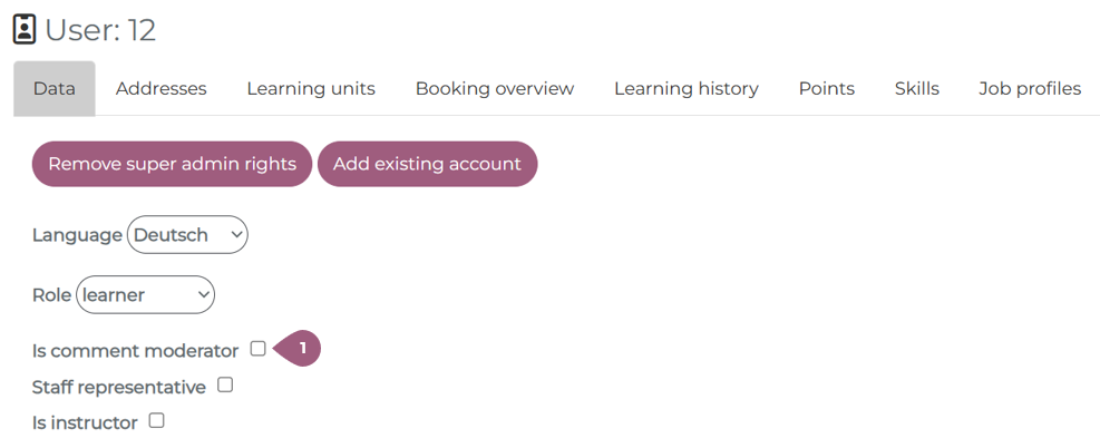Under Administration > Users > Select Users: in the respective user profile, you can designate a user as a comment moderator (1):