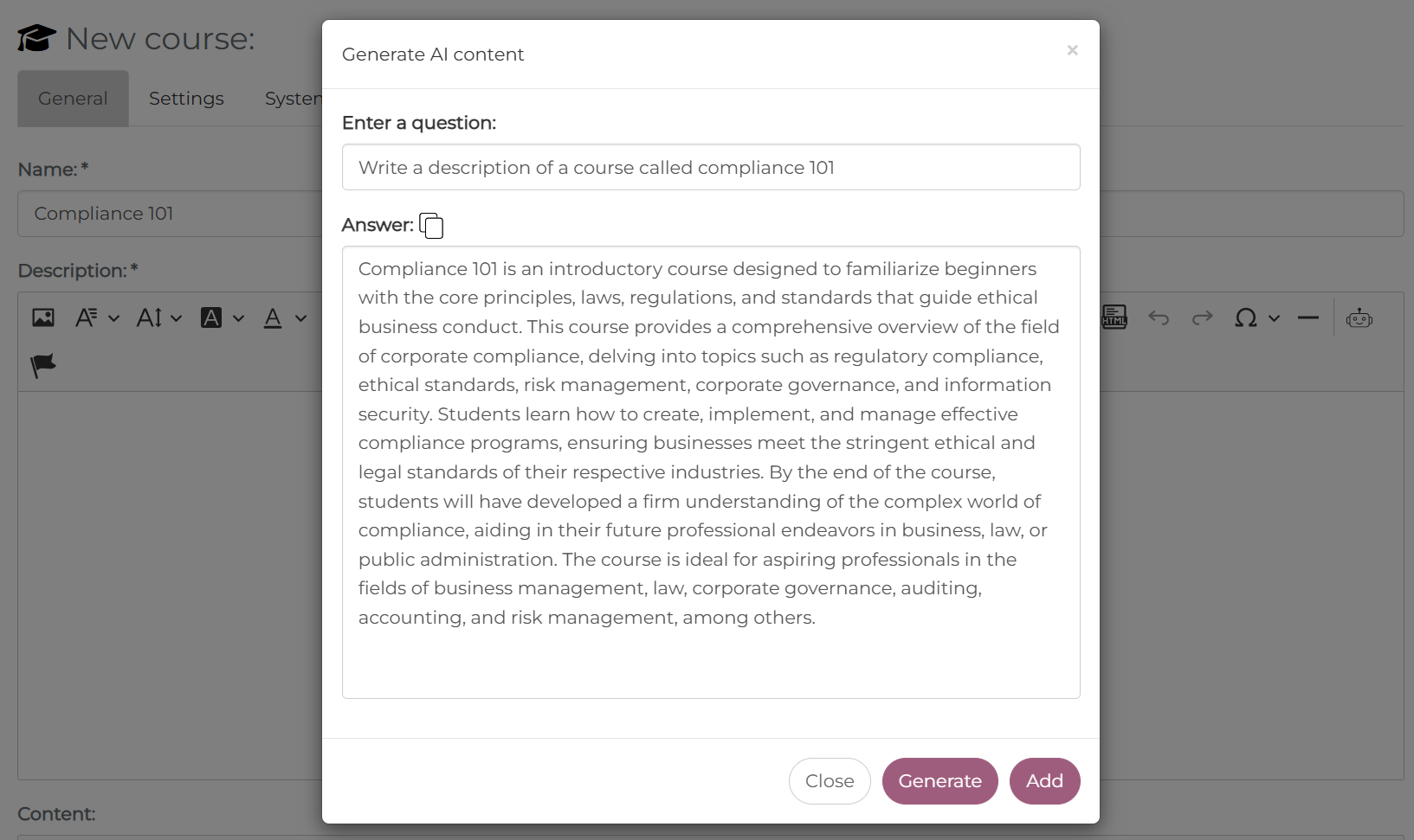 AI – Generate Descriptions When creating a learning unit, you can use AI to generate the description. When you enter a question, the AI generates a corresponding answer that you can add as a description of the learning unit.