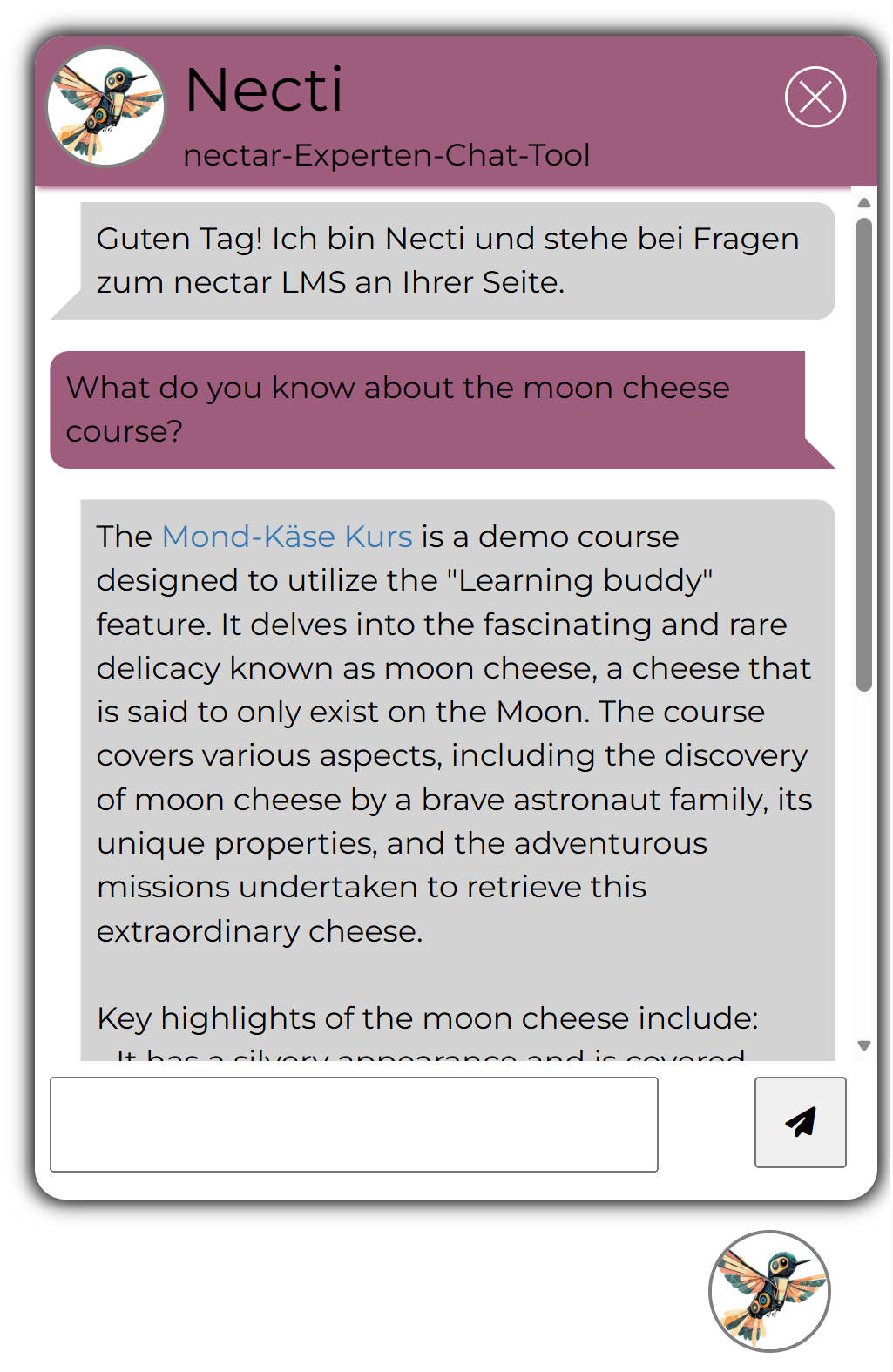 Starting with version 5.0.0, nectar LMS offers Learning Buddy as a paid add-on option—an AI-powered learning assistant that helps learners understand content at any time.