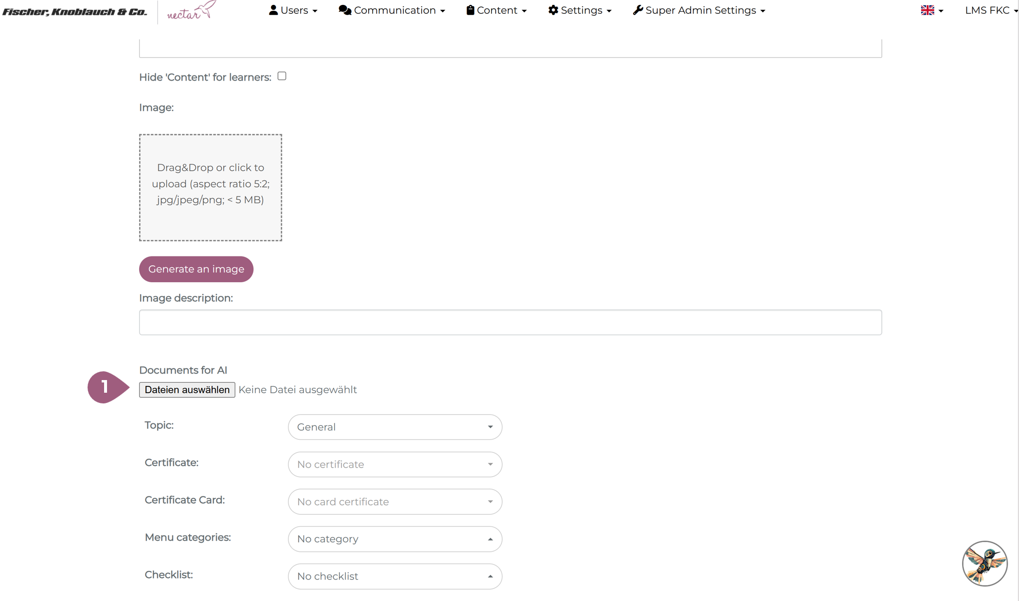 Administrators have the option of uploading documents to courses (WBTs). This content is used by the Learning Buddy to improve the quality and relevance of the answers. This can be done in the general settings when creating or editing a course (1):