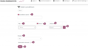 If you want to add an assignment condition (3), first enter the name of the condition (6). Under “Key” (7), you will find the attributes that you previously selected in the configurations. At this point, you can define the key by assigning it a value (8) and use the drop-down menu to determine which action (9) must apply.