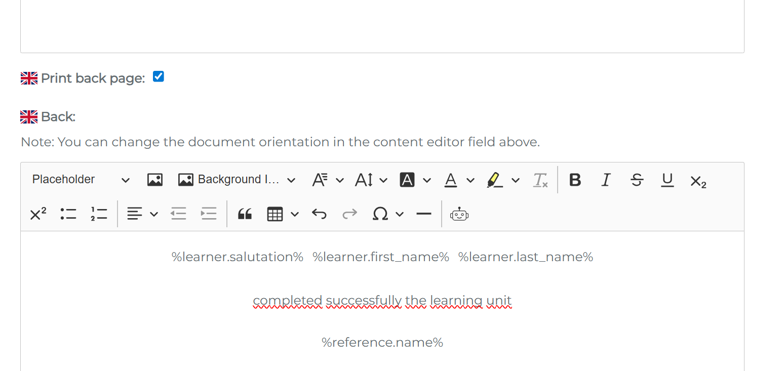 It is also possible to create double-sided certificates. If you check the “Print back” box, a second page of the certificate will be generated. The back can be customized just like the front: