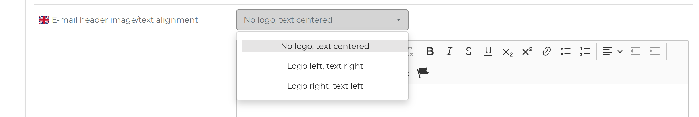 (55) Email header image/text alignment: Administrators or super administrators can customize the arrangement of the images (logo) and text in the email header using the “Email header image/text alignment” setting under Administration > Settings > Configuration > Settings: