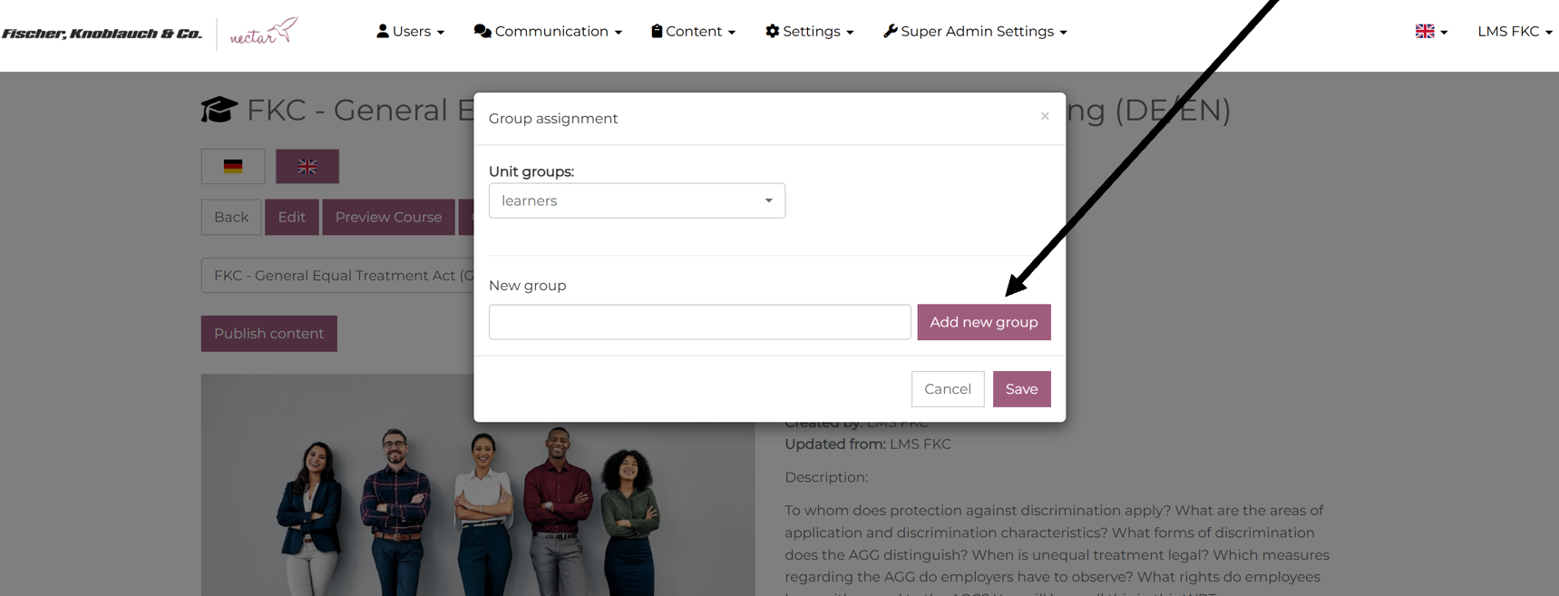 (52) Default parent group for new assignment groups: Administrators or super administrators can use the “Predefined parent group for new assignment groups” setting under Administration > Settings > Configuration > Settings to define the parent group to which newly created groups are assigned when they are created as subgroups via the modal window (see screenshot) for assigning unit groups. This parent group cannot be deleted in the main group view.