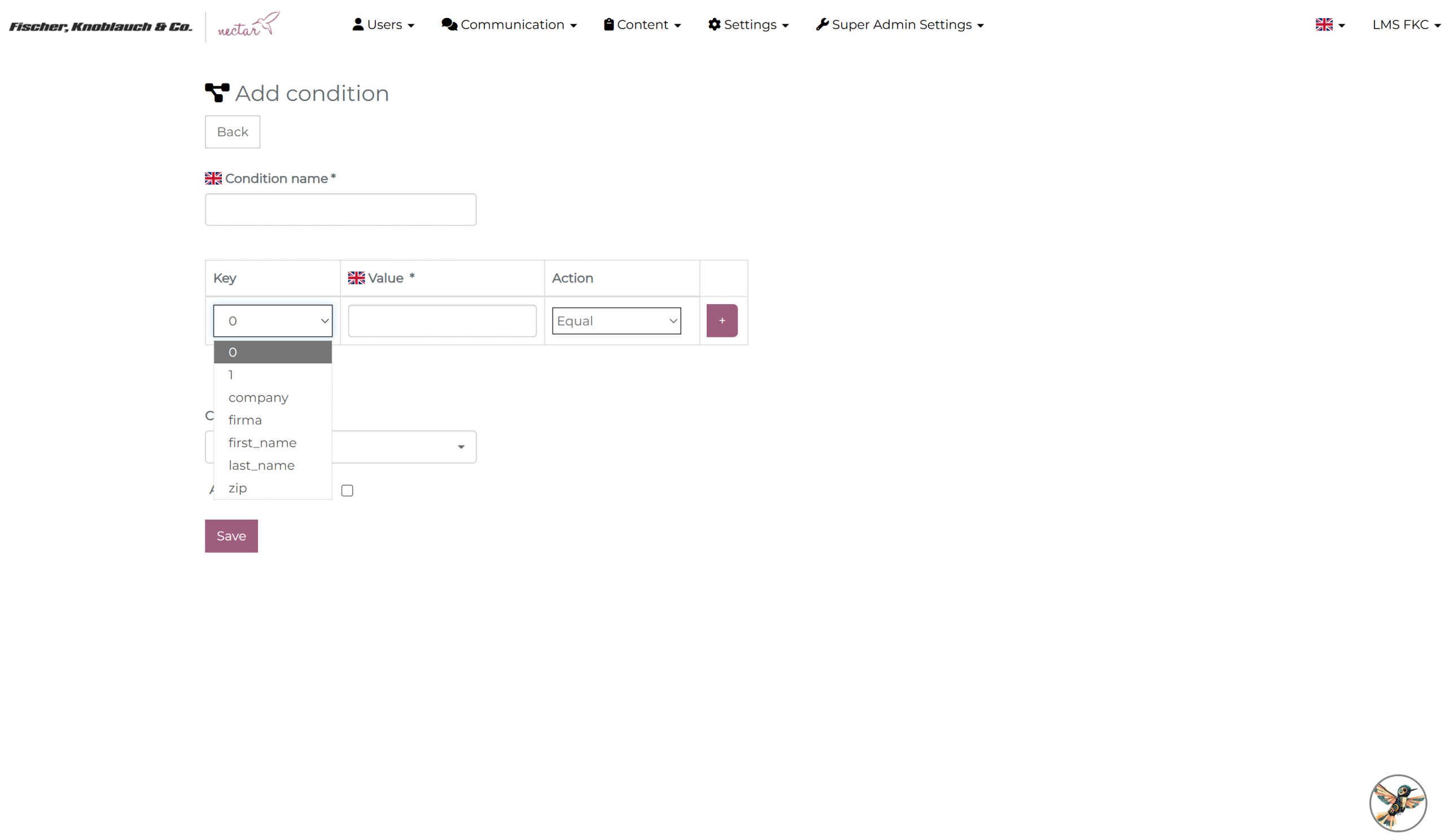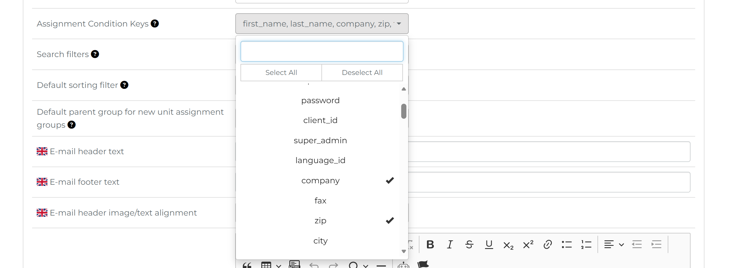 (49) Assignment Conditions Keys: Administrators or super administrators can use the “Assignment Conditions Keys” setting under Administration > Settings > Configuration > Settings to specify which keys should be allowed for creating automatic group assignments. Only the user properties you have selected here: