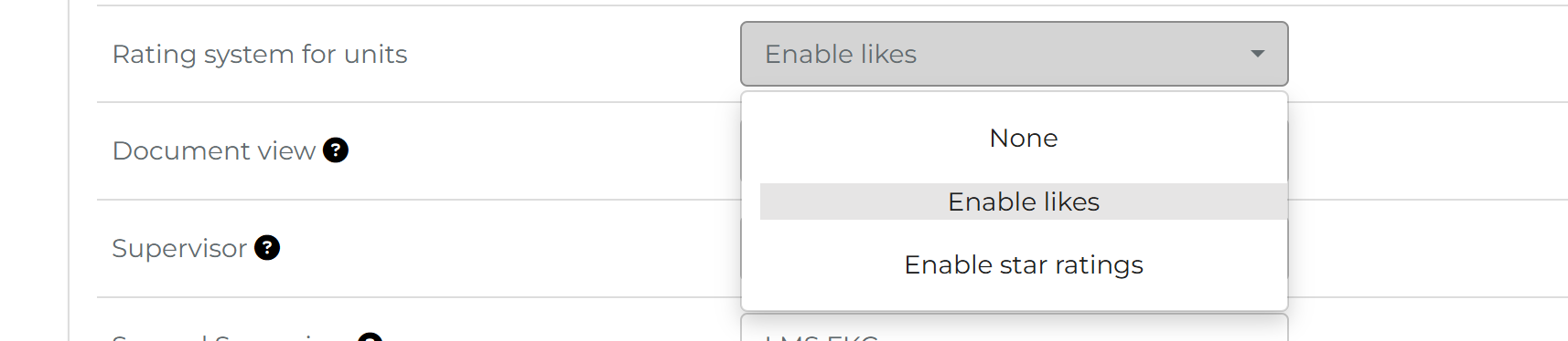(44) Rating system for units: Administrators or super administrators can adjust unit ratings using the “Rating system for units” setting under Administration > Settings > Configuration > Settings. They can select whether no rating, only likes, or only star ratings should be displayed: