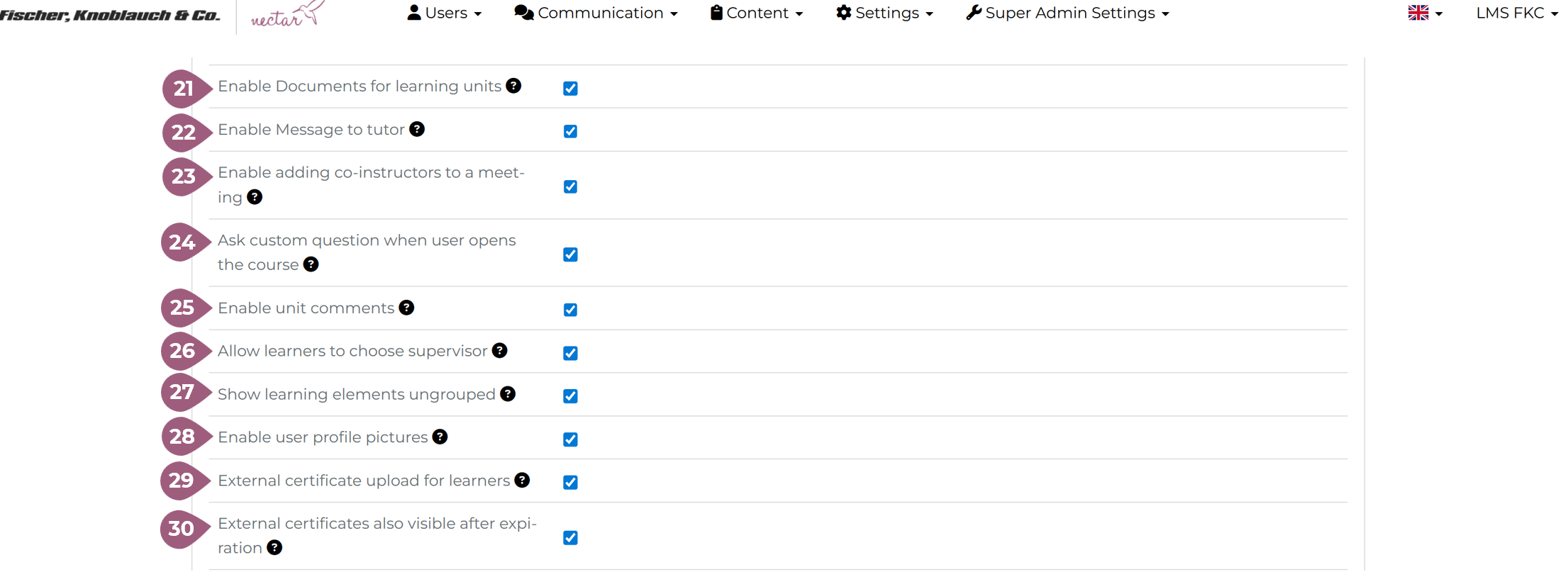 (12) Enable unit recommandations: If administrators or super-administrators have enabled the “Enable unit recommendations” setting under Administration > Settings > Configuration > Settings, learners can view further unit recommendations under the heading “Recommended for me” after completing a unit. If you do not want these recommendations to be displayed, please disable this feature.