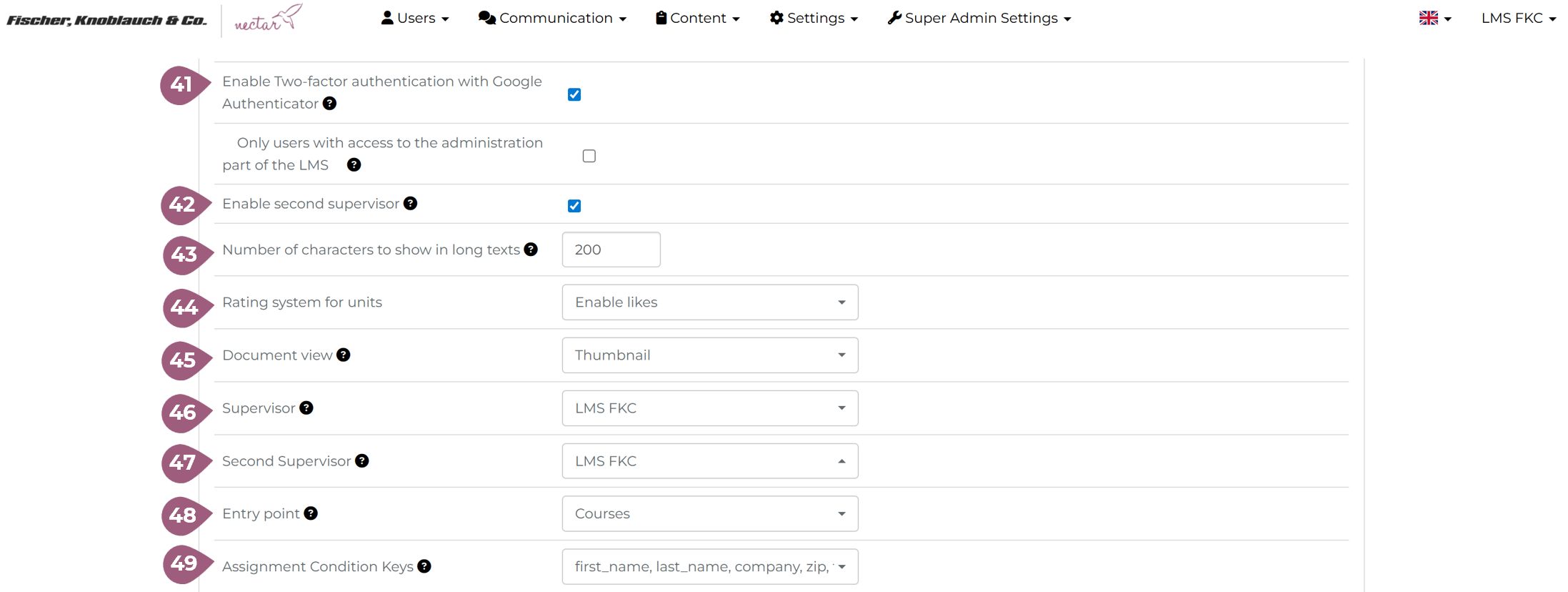 (47) Second Supervisor: Administrators or super administrators can define the default second supervisor for the current tenant using the “Second Supervisor” setting under Administration > Settings > Configuration > Settings, if the second supervisor setting is enabled (42). This supervisor is selected by the LMS as the default second supervisor for all users if no supervisor is specified.