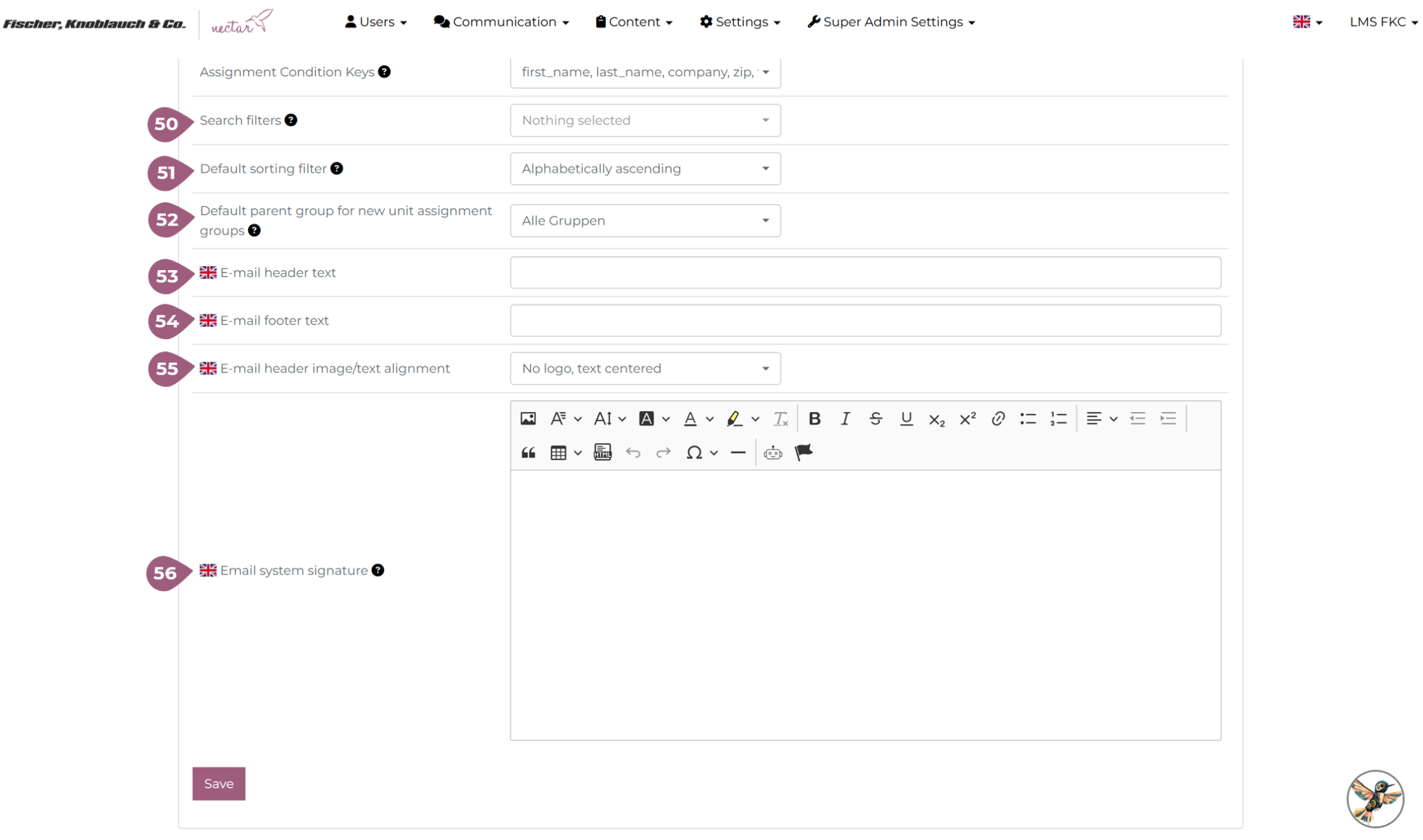 (56) Email system signature: Administrators or super administrators can use the “Email System Signature” setting under Administration > Settings > Configuration > Settings to define the email signature that will be attached to all system emails for the current client.