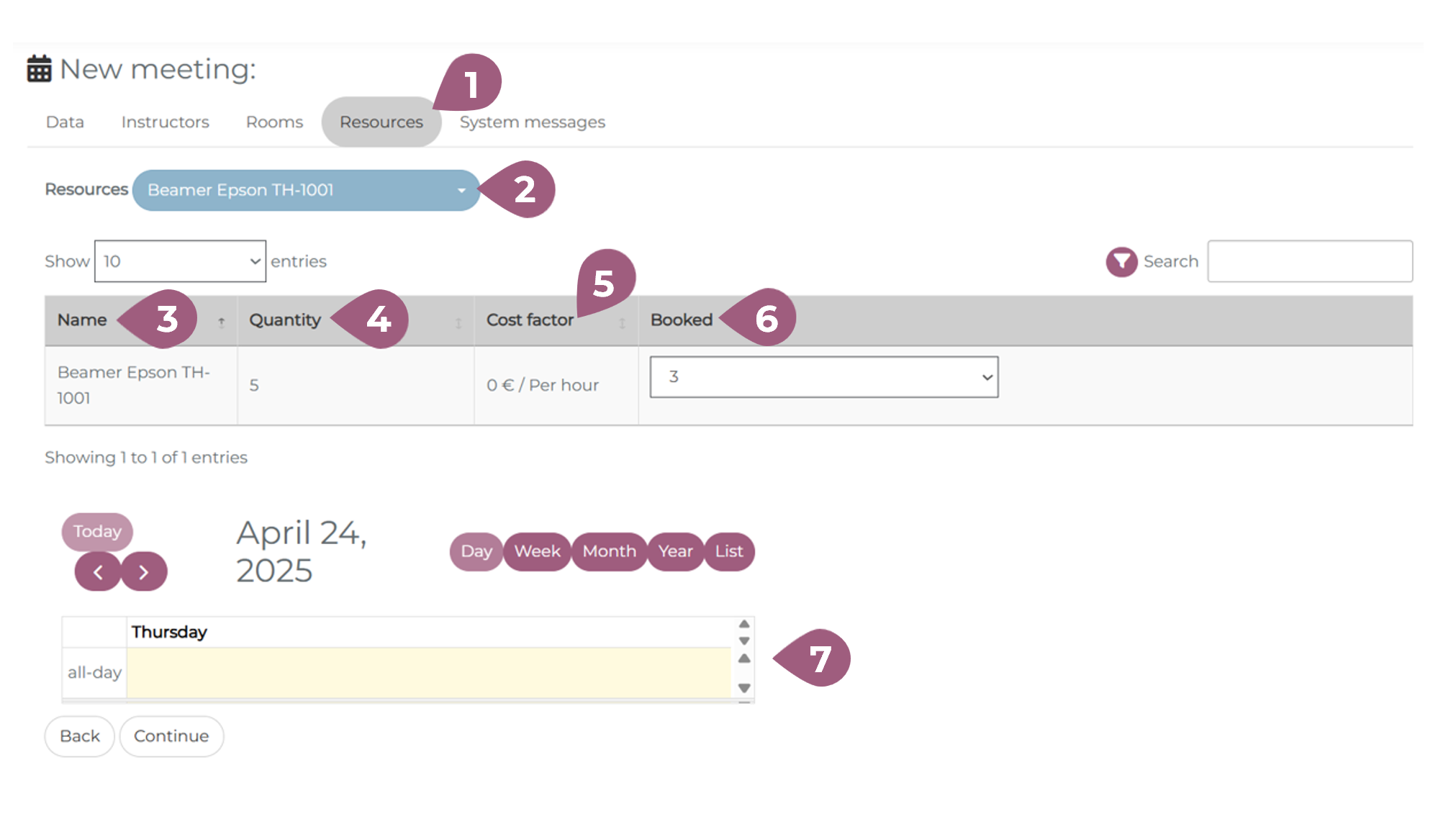 For physical meetings, it is also possible to manage the resources available in a given room or location. In the “Resources” tab (1), you choose the desired resource in the drop-down menu (2). The table below shows the name (3), quantity (4), cost (5), and number of the item booked (6). The calendar below (7) shows the resource availability on the given day. More information on managing resources can be found at: Managing Resources – coming soon!