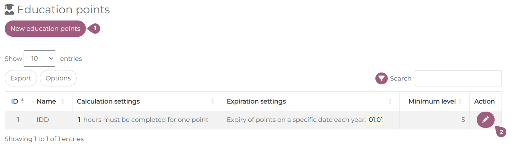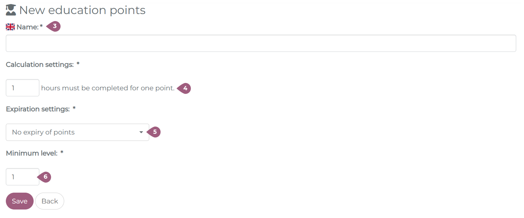 Unlike gamification points, which are based on learning progress, education points are calculated based on the time a user spends within a learning unit. Education points can be activated under Super Admin Settings > System Configuration > Education Points. After activation, a new tab called Education Points appears under Super Admin Settings. Here, you can see the overview table for all education points in the LMS. With a click on “New education points”, you can create more types of points. In the overview table, you can edit points using the pencil icon (3) or delete points using the trash icon (not pictured). Important: Before education points can be deleted from the LMS, they must first be removed from all individual users. When creating new education points, the following four fields must be completed: The calculation setting determines how many learning-time hours a user must complete to earn one point. The expiration settings determine when the education points, if at all.There are three available expiration options (6): If “Manual reset of points” is selected, a “Reset” button appears next to the drop-down menu. Clicking this button marks all education points for all users as expired. If “Automatic expiration on a specified date” is selected, an expiration date must be defined. All education points awarded in the LMS up to that date will expire on the selected date — regardless of when they were originally earned. The Minimum level defines the minimum number of education points a user must achieve to complete their mandatory point goal (7). Click “Save” to activate the selected settings. Within the settings of each learning element, a learning time can be specified (9). To calculate education points that can be earned by completing this learning unit, you must select the corresponding education point type from the drop-down menu (10). The calculated number of points is displayed automatically (11). Points are calculated according to the rules defined under Education Points settings. The calculated value can also be manually adjusted — both higher and lower values are possible. Note: If a minimum completion time is required, the user must spend at least the defined amount of time in the learning unit to receive the points. The awarded education points (12) are displayed directly next to the gamification points. Education points can be assigned to the following learning elements: Education points are displayed in the “Education Points” tab (13) within the user profile. The number of valid points is shown at the top (14). The “Add mandatory training points” button (15) determines which points are displayed in the progress graphic (16). When the circle graphic is fully filled, the minimum level has been reached. From the user profile, education points can be: Note: Once the education points for a learning element have expired no additional points can be earned from that element and existing points cannot be edited. To allow users to earn points again, an administrator must delete the existing points and reset the learning progress. Statistics for education points can be accessed under: Within the statistics view, points can also be:Education Points: Settings