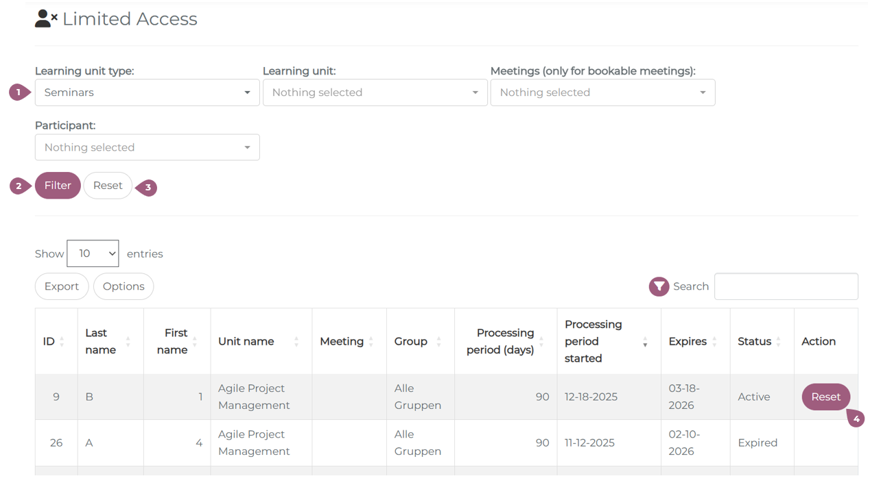 If a processing period has been defined for learning units with restricted access, this can be reset individually in the “Action” column (4). This gives the user access to the learning unit again.
