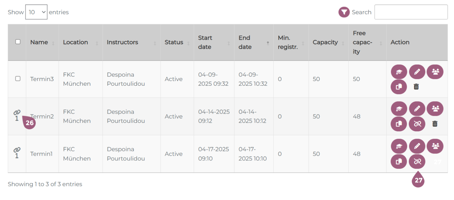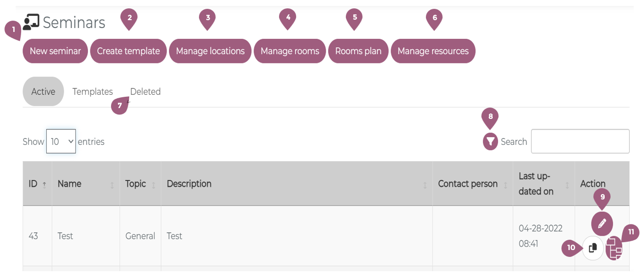 - Using the copy symbol (10), you can duplicate a seminar. Note: when copying a seminar the participants are not duplicated. They will have to be manually added later.