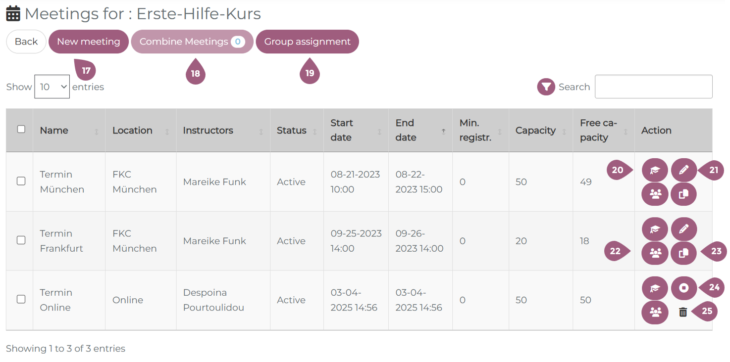 - the trash can symbol (25) is used to delete a meeting. Note: meetings can only be deleted when there are no participants assigned.