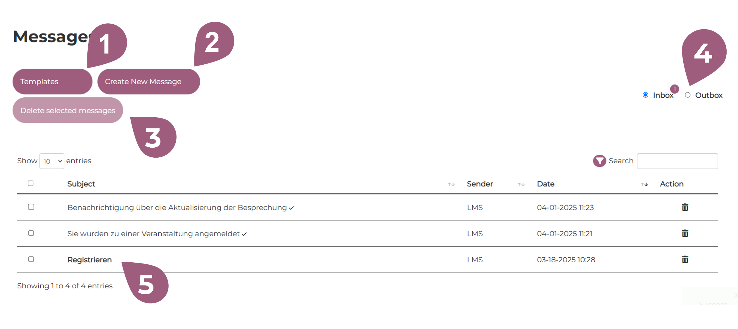 You can create templates (1) that can be sent at a later time. To send a message, you must create a new message (2). You can select and delete multiple messages in the table on the right or delete (3) individual messages using the trash can icon. You can also switch between the inbox (4) and outbox (4). Unread messages are displayed in bold in this overview (5).