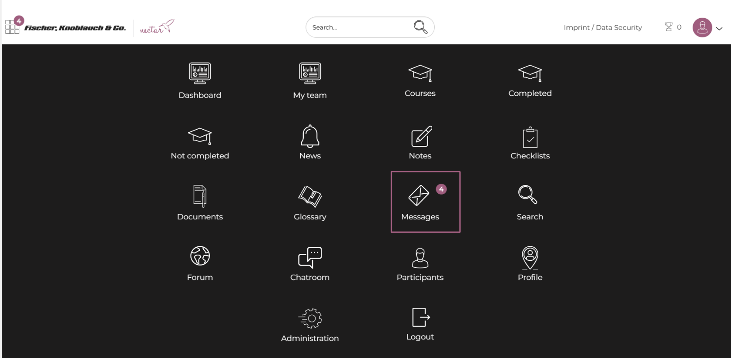 You can access and manage messages via your menu view. Information on how to make messages visible in the menu can be found in the article “Configuring the Menu“. Messages allow you to send or receive notifications within the LMS or via email.