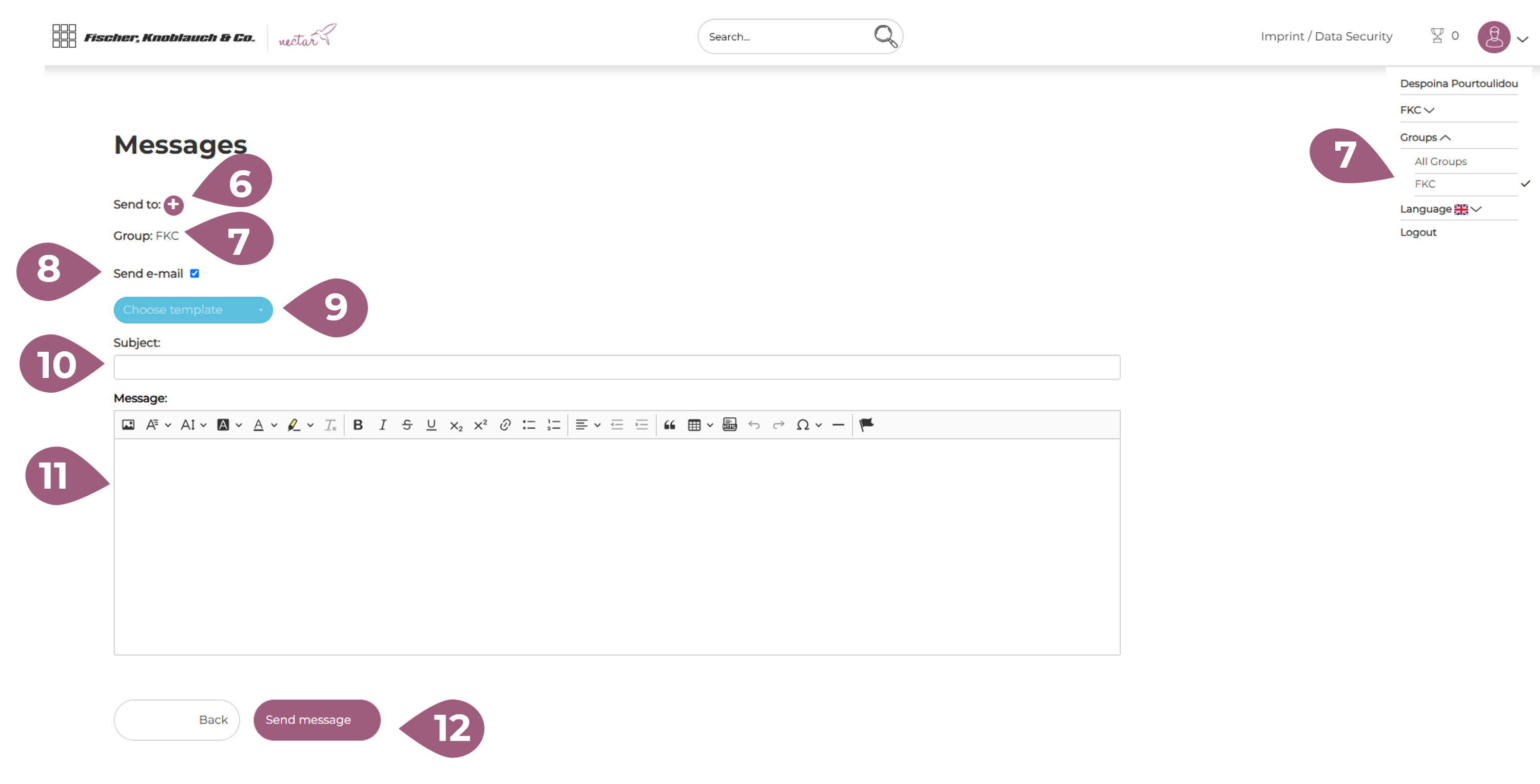 When you create a new message, you can specify the people (6) to whom the message should be sent. A pop-up window opens and you can select the recipients using the dropdown menu. Depending on the group (7) you are in, the users from the corresponding group will be displayed as recipients. If you tick “Send email” (8), the message will be sent as an email at the same time. You also have the option of using previously created templates (9) as a message. You can then enter a subject (10) and compose your message (11). Finally, the message can be sent (12).