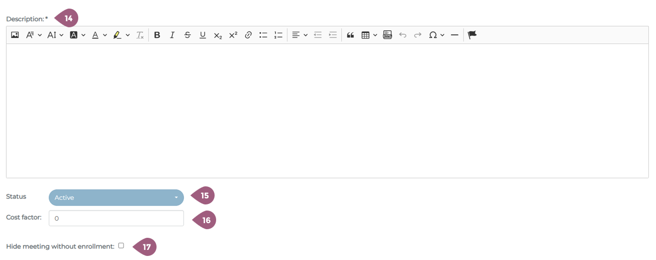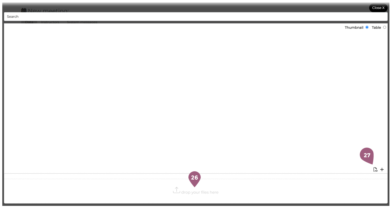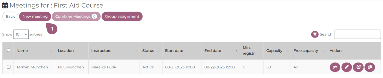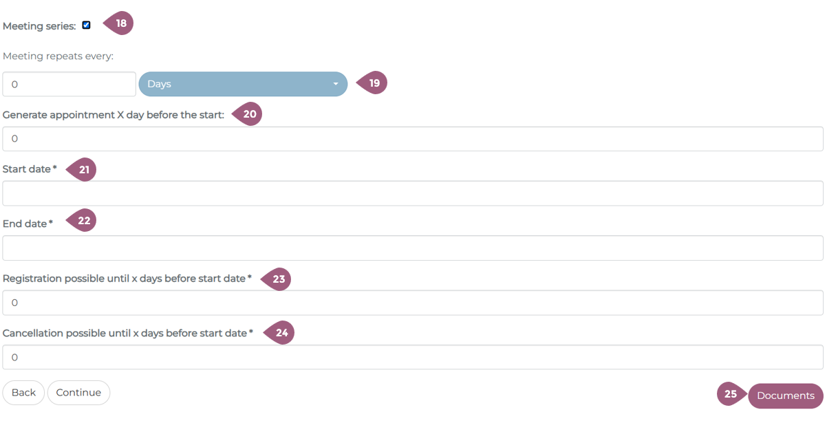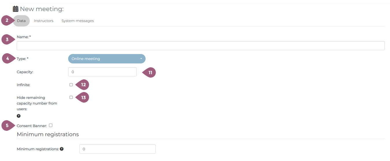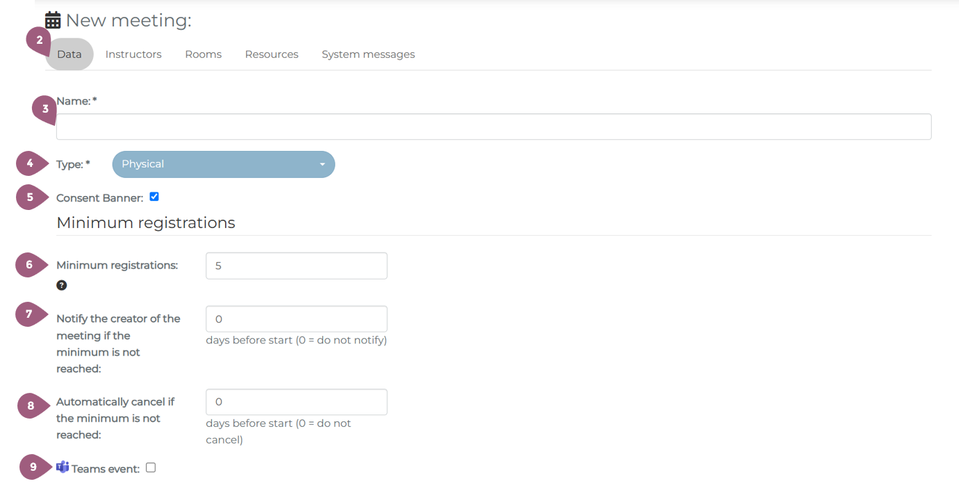 After you have entered the general information and configured the settings for a seminar, you will be asked to create a meeting. In order to create a new meeting, you must go to Adminsitration > Content > Seminars > “Manage Meetings.” There you will see the button “New Meeting.” (1). Note: If a seminar does not contain any meetings, it will not be visible or able to be assigned to any groups. To create a meeting, you must begin in the tab “Data” (2). The name (3) of the meeting and the type (4) of meeting must be selected. Using the drop-down menu, meetings can be designated as either physical or online. Optionally, a consent banner (5) can be activated that the participants must acknowledge before enrolling in the seminar. This can be used for cookies, disclaimers, etc. It is also possible to designate a minimum registration number (6). If this number is not reached within the specified timeframe, it is possible to inform the meeting creator (7) and/or automatically cancel the meeting (8). These options are only displayed when the minimum participant number is greater than 0. It is also possible to designate the meeting as a Teams event (9). Creating an online meetings is very similar to creating physical meetings, but there are a few extra settings to take into consideration. When under type (4) online meeting is selected, the capacity (11) must be entered. It is also possible to have no capacity limit, in which case “Infinite” (12) needs to be selected. If desired, it is also possible to hide the remaining number of available spots in the meeting from the learners (13). The link for the meeting is automatically generated when the event is hosted on Teams (10). As with physical meetings, it is possible to tailor the meeting settings to your needs. Every meetings requires a brief description (14). Key words, bullet points, or a paragraph can be used to describe what will be discussed. The description will be displayed in the key info section of the meeting (for more see: Seminars: Learner’s View – coming soon!). The status of the meeting (15) is automatically listed as active, but can be changed to planning or cancelled. The setting cost factor currently has no fuction and will be removed in further updates. If you want to learn more about seminar costs, check here: Seminar Cost Statistics – coming soon! Should you choose, it also possible to hide the meeting from participants unless they are enrolled in it (17). With the “Meeting series” setting (18), it is possible to create a repeating meeting. You can set the frequency with which the meeting repeats (19) as well as when the meeting will be created in the system. Participants are automatically enrolled in future meetings. The start date (21) and end date (22) of the meeting are required. You must also specify until when it is possible to register for the meeting (23) or cancel the meeting (24). 0 days means that it is possible up until the start of the meeting. Finally, it also possible to attach documents to the meeting (25). These can be PDFs, Word documents, etc. that you would like to make available to all enrolled participants. The documents can be uploaded using the Drag and Drop function (26). It is also possible to add documents that were already uploaded into the Mediapool (27). Information about the Mediapool and how to upload documents there can be found at: Mediapool – coming soon! Once you are finished adding documents, you can close the window and move on to the next steps. Information about the Tab “Instructors” and how to add instructors per meeting can be found at: Create a meeting: Instructors Information about the Tab “Rooms” and how to add rooms per meeting can be found at: Create a meeting: Rooms Information about the Tab “Resources” and how to add recourses per meeting can be found at: Create a meeting: ResourcesSeminars: Create a Meeting