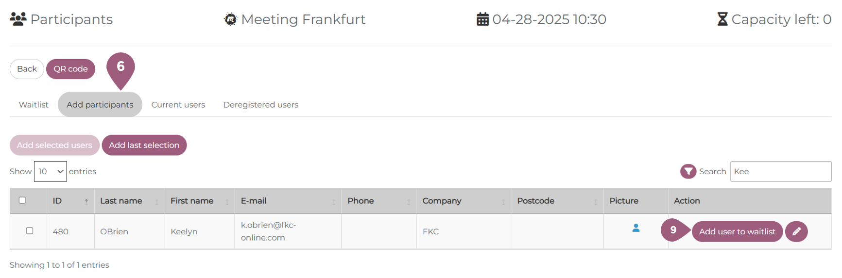 If the seminar has a limited capacity, the waiting list feature can be activated in seminar settings (Seminar > Edit > Settings > Activate waitlist). The waitlist can be managed from the participant overview (to navigate here see steps 4 and 5 above). When there are no longer free places available, the “Add User” button will become “Add user to waitlist” (9).