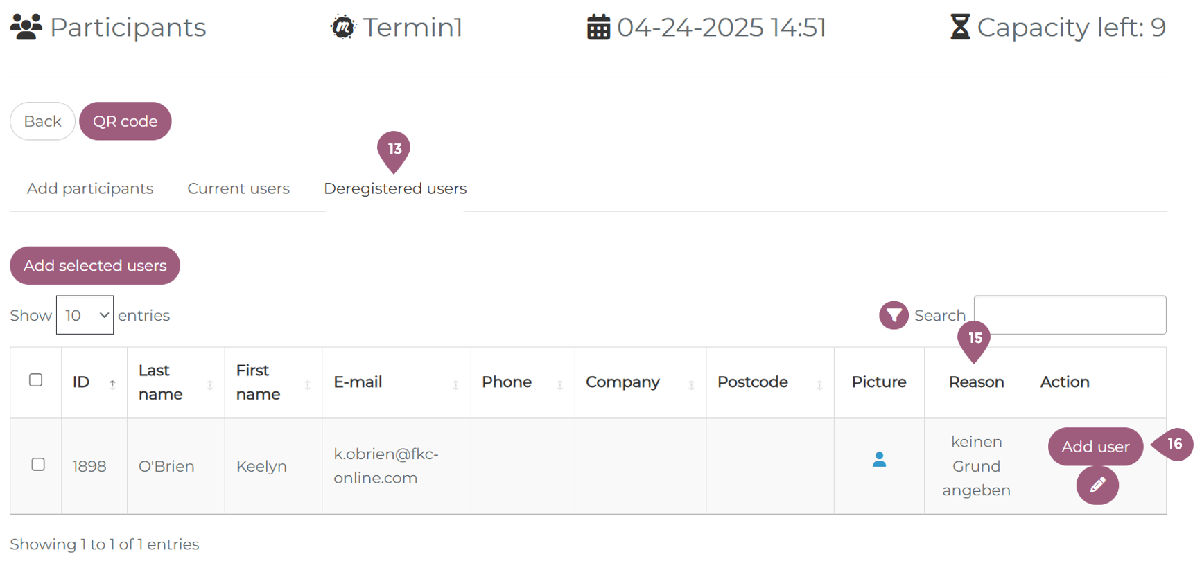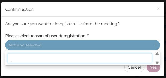 Deregistered users must have a reason for the deregistration, which can be selected from a pre-programmed dropdown menu. The menu can only be edited by Superadministrators under Administration > Super Admin Settings > System Configuration > Reasons of meeting deregistration. The given reasons for deregistering can be found in the Reason column (15) in the deregistered users tab (13).