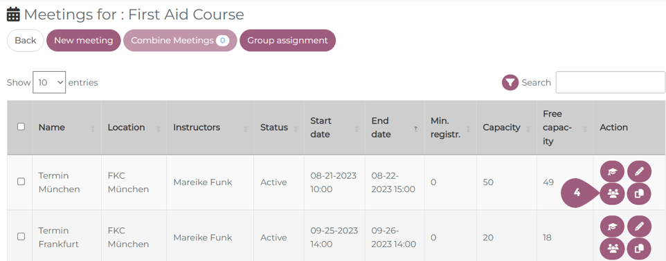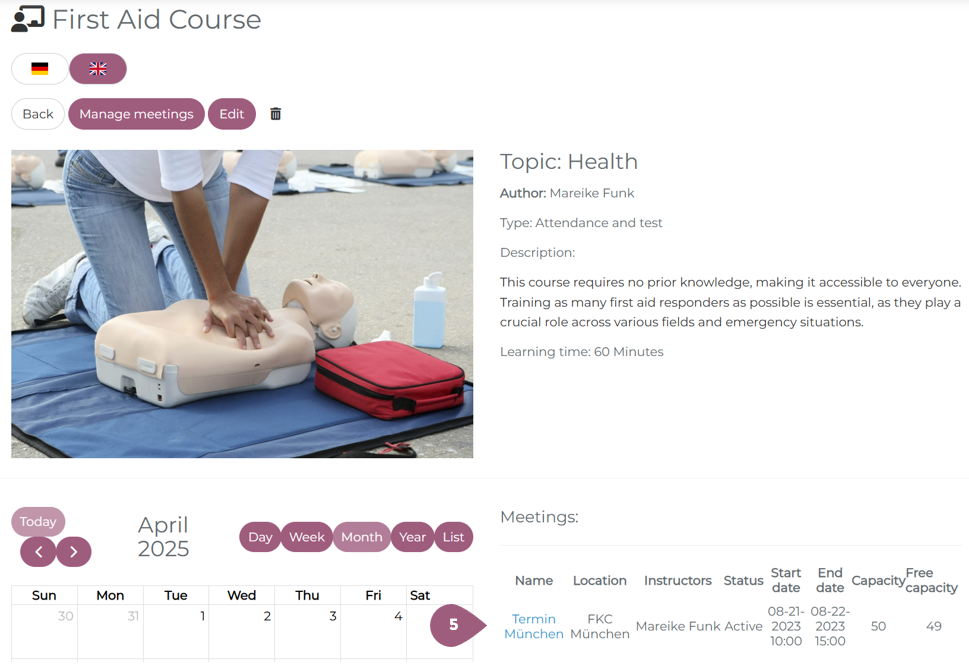 If the setting “Registration only possible for one meeting” is activated, the learners can only register themselves for one meeting in the seminar. If the setting “Automatic enrollment” is activated, all users of a group will be automatically enrolled in all meetings of the specified seminar as soon as the seminar is assigned to the group. Users will also be automatically enrolled in further meetings that are created. If there is not enough free space available for all users in the group to enroll, the Admin will be notified. More about seminar settings can be found here: Seminars – Settings (coming soon!).