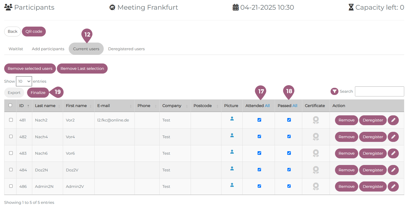 Once the meeting has taken place, it is possible to finalize the meeting (19) and send out the certificate (20) in the “Current Users” tab (12). Note that a meeting cannot be closed before it has taken place. Once a meeting has been closed, it cannot be changed. The status of the participants is included in the statistics and learning history as it is at the time of completion. In order for the entire seminar to be recorded as “complete,” the user must have recorded attendance in at least one meeting that has been closed (it is in the past). Closed meetings can be re-opened to edit the attendance record, pass record, or certificate of the participants but only by superadmins.