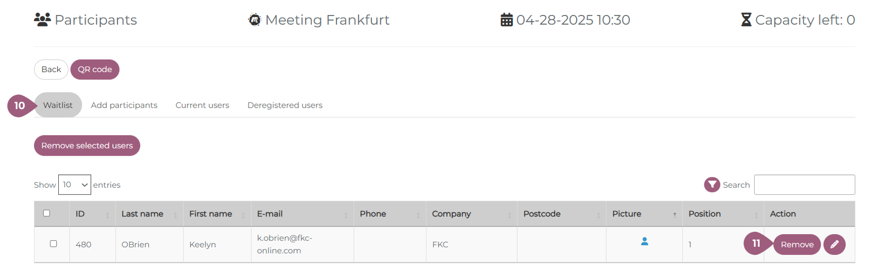 Once clicked, the user will be added to the waitlist, which can be seen under the waitlist tab (10). Users on the waitlist will automatically be enrolled in the seminar in the order they were added to the waiting list. It is not possible to change the order of participants on the waitlist. Should the capacity of the seminar be increased, participants will be automatically added from the waitlist to the seminar until the new capacity is reached. Users can also be removed from the waitlist (11). They can be readded at any time but will lose their position on the list.
