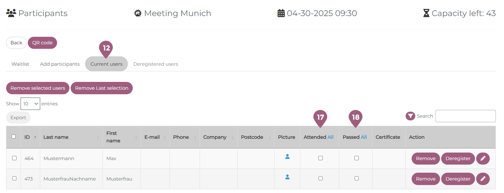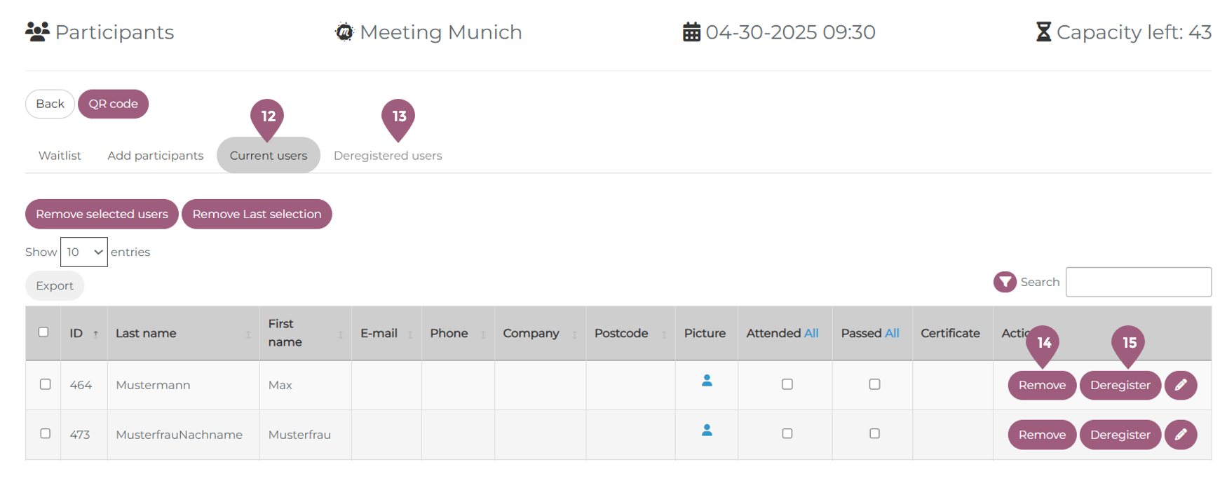 In the current users tab (12), it is possible to see all currently enrolled users in the seminar. From this page, it is possible to remove users (14) from the seminar, in which case they will return to the add “Participants” tab (6) or to deregister users (15), in which case they will appear in the “Deregistered users” tab (13).