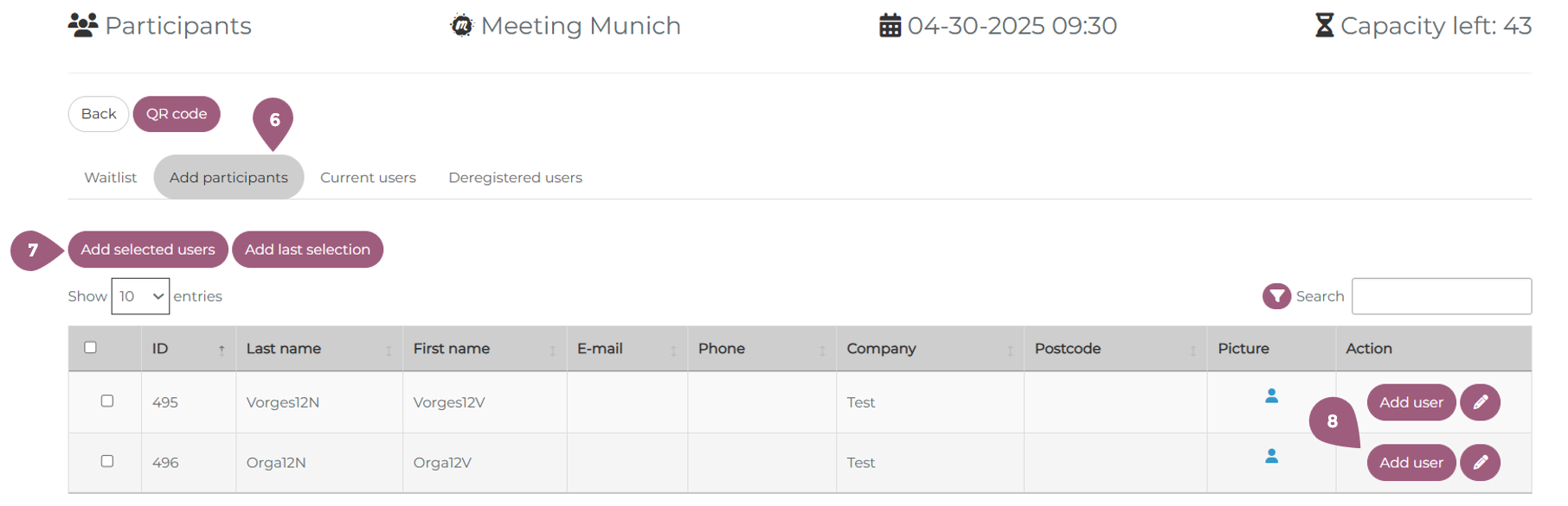 Now, you should see the Participant Overview. You should land on the page “Add Participants.” (6) Here you can either add users individually (“Add users” button (8)) or add a selection of users to the seminar (add selected users (7)). Participants are now registered and receive an automatically generated confirmation message.