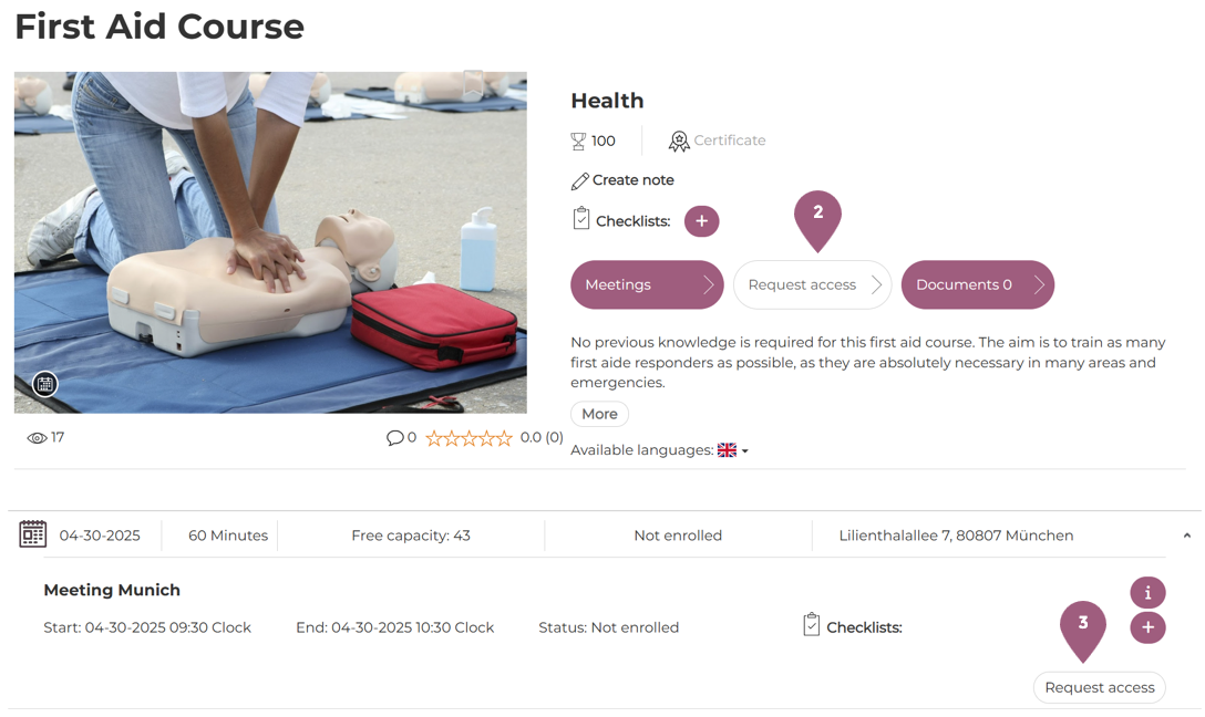 It is possible to require users to receive access or approval before they can enroll in a seminar. This can be activated for seminars (2) with the “Approval Required” setting and for individual meetings (3) with the “Approval for single dates” setting (Administration > Content > Seminars > Settings). In order to require approval for single dates, the setting Approval Required must also be activated. The users will see a “Request access” button instead of the usual “Enroll.”