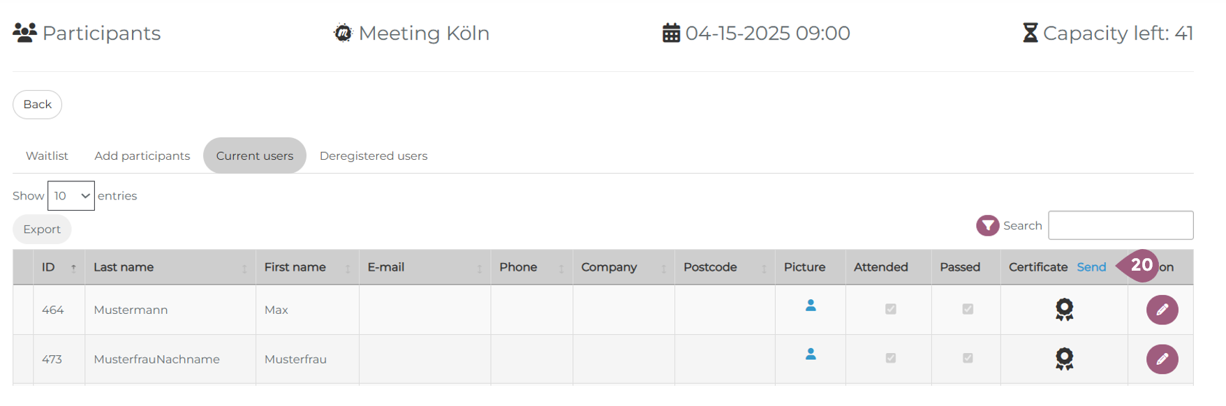 After a meeting has been closed, the certificate can be downloaded by participants and admins. The certificates can also be sent to the participants via email and system message. This can be done using the “Send” button (20).