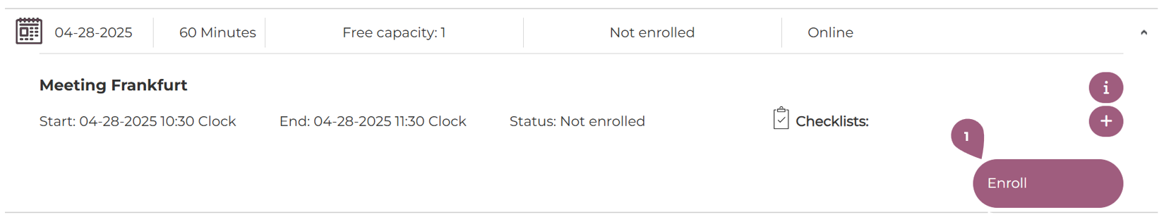 If a seminar does not have any special settings and is assigned to a group, it is visible to the learners. They can then register themselves for as many of the meetings as they like by clicking on “Enroll” (1).