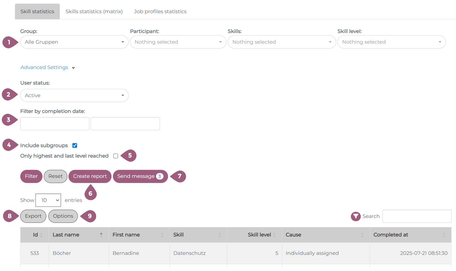 The skill statistics (detail) page show results for individual skills and individual learners or groups. The following filter options (multiple selections are possible) are available there: