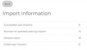 - Deleted users: Number of users who have been set to “inactive.” No permanent deletion takes place during CSV import. To permanently remove a user, they must first be set to “inactive” and then manually deleted from the LMS.