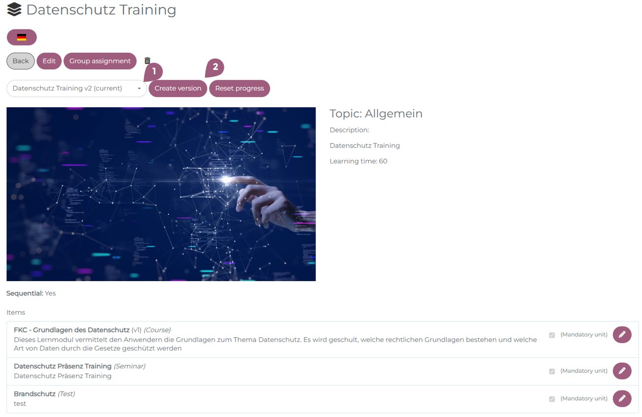 The version of the course or curriculum is shown in a dropdown menu (1). The version number is listed next to the name of the learning unit. It is possible to view the configuration of previous versions by selecting it from the menu. Previous versions can be edited, but only in the limited ways mentioned below. To make changes to a curriculum or course, a new version is most likely required (2). Clicking on “Create version” duplicates the existing version and unlocks previously fixed settings. It is then possible to make as many changes as desired to the course or curriculum. Users will not see any of these changes until the new version of the learning unit is published.