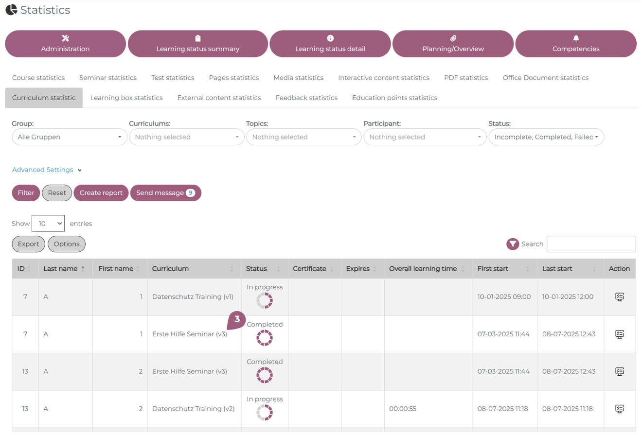 In the statistics, versions appear as (vX) next to the name of the learning unit (3). It is possible to see which version each individual user has completed, in progress, or been assigned. The statistics reflect the current state of the LMS, so previous version assignments are only visible when “historical progress” is also selected in the advanced settings.