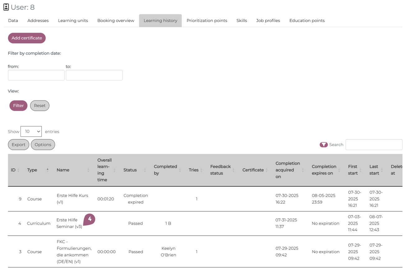 Similar to statistics, versions are visible in both the learning units and learning history in the user profile. (vX) appears next to the name of the learning unit to indicate which version the user has been assigned, made progress on, or completed (4).