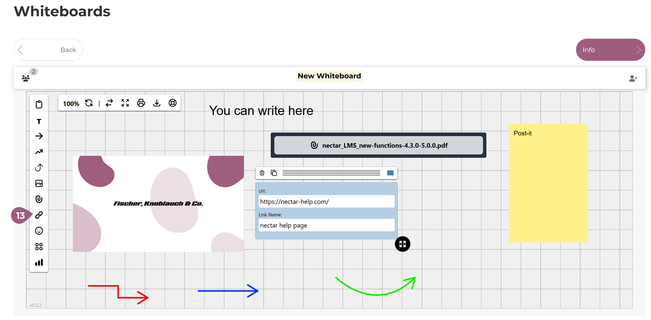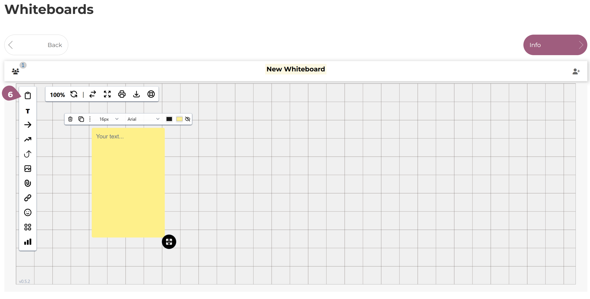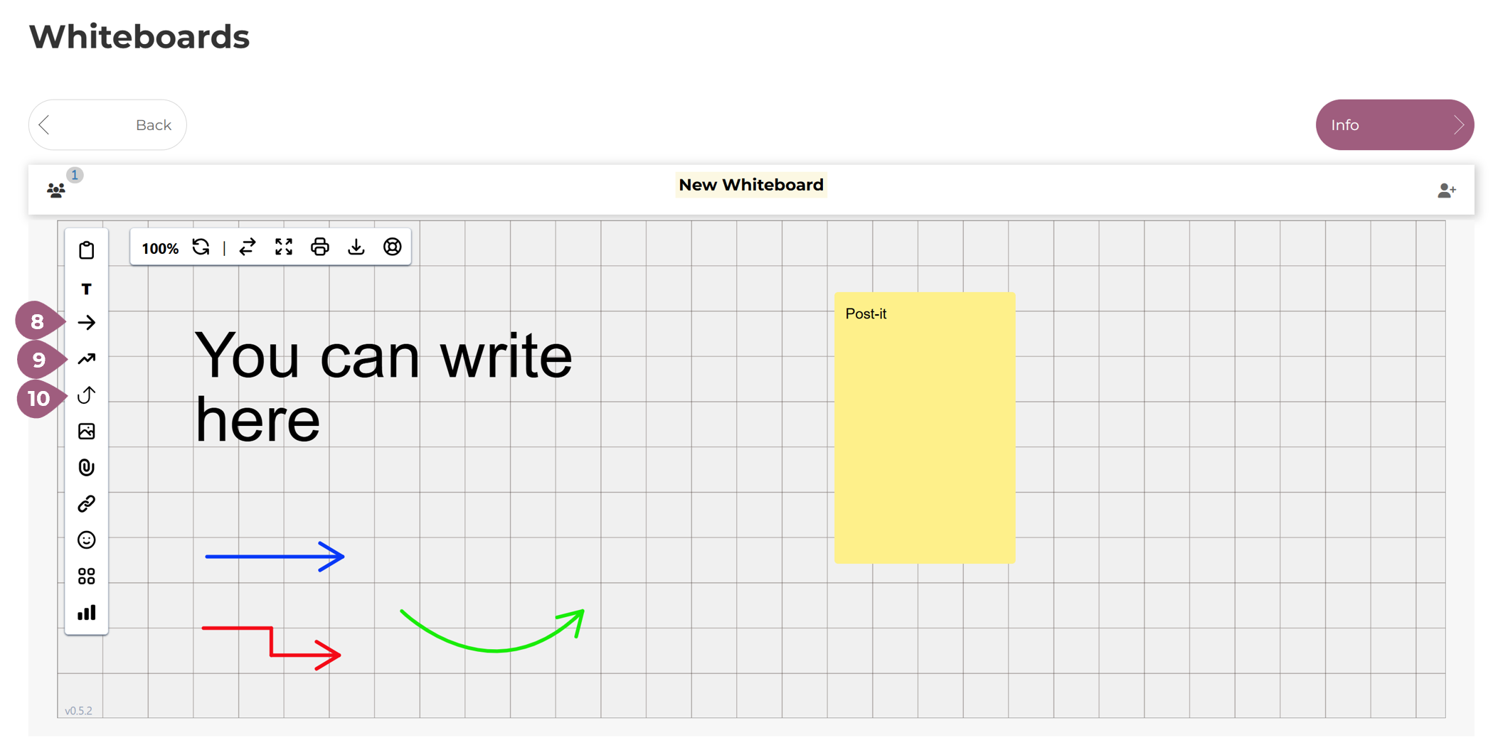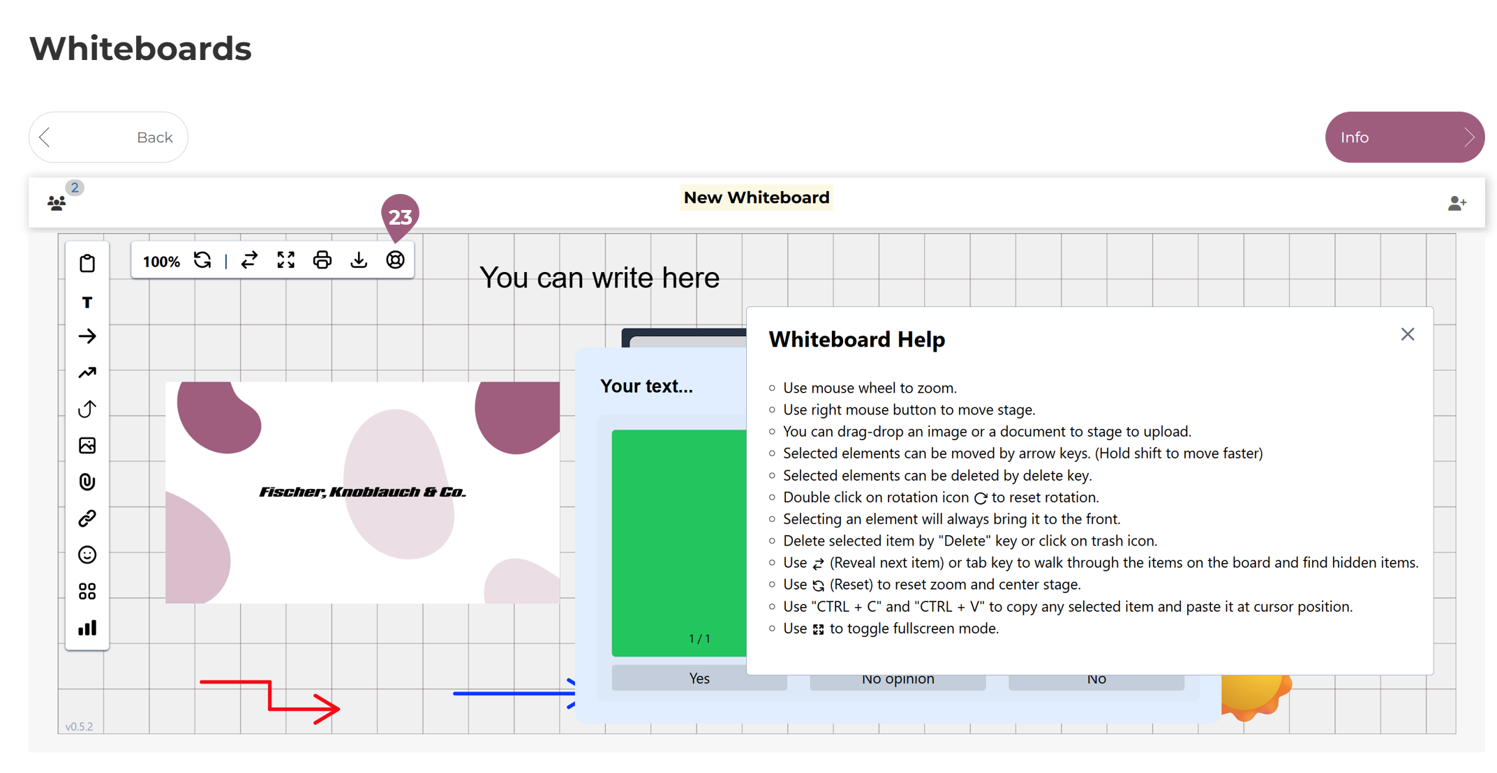 (5) Whiteboard information: The “Info” button provides further information on managing the whiteboard: