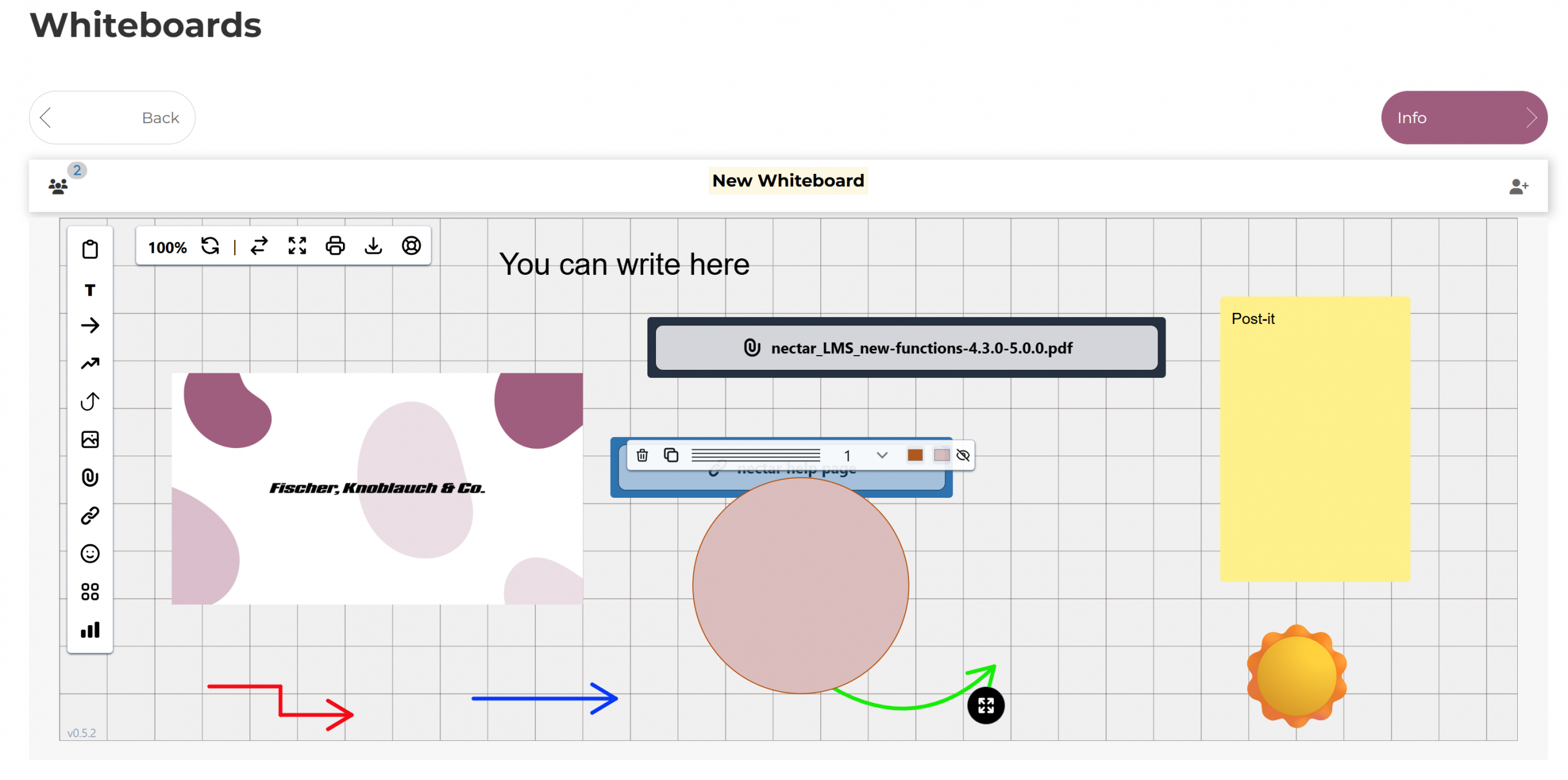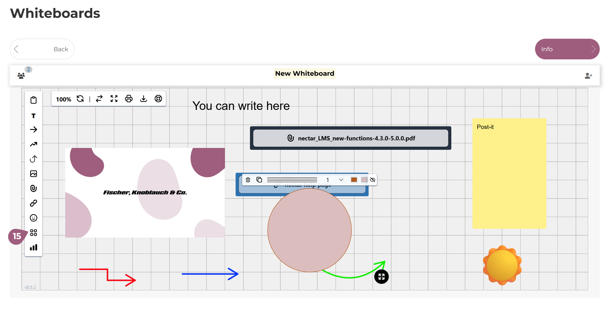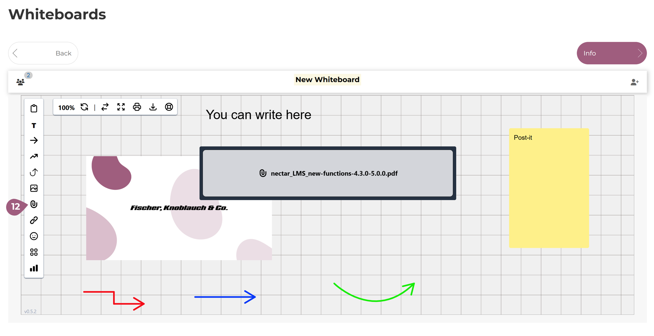 (5) Whiteboard information: The “Info” button provides further information on managing the whiteboard: