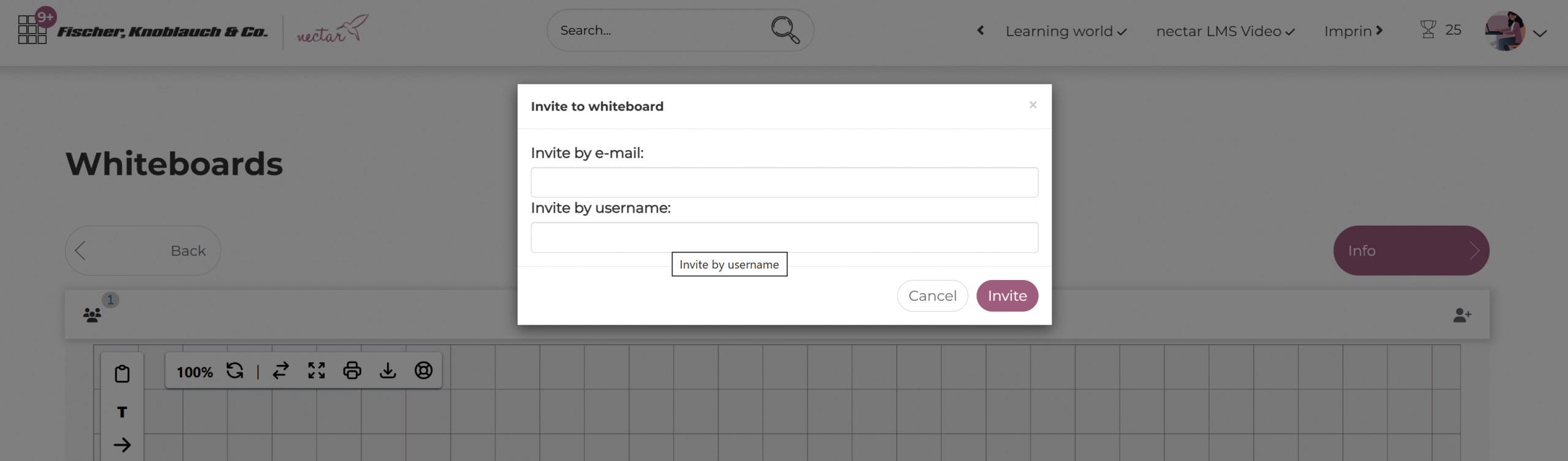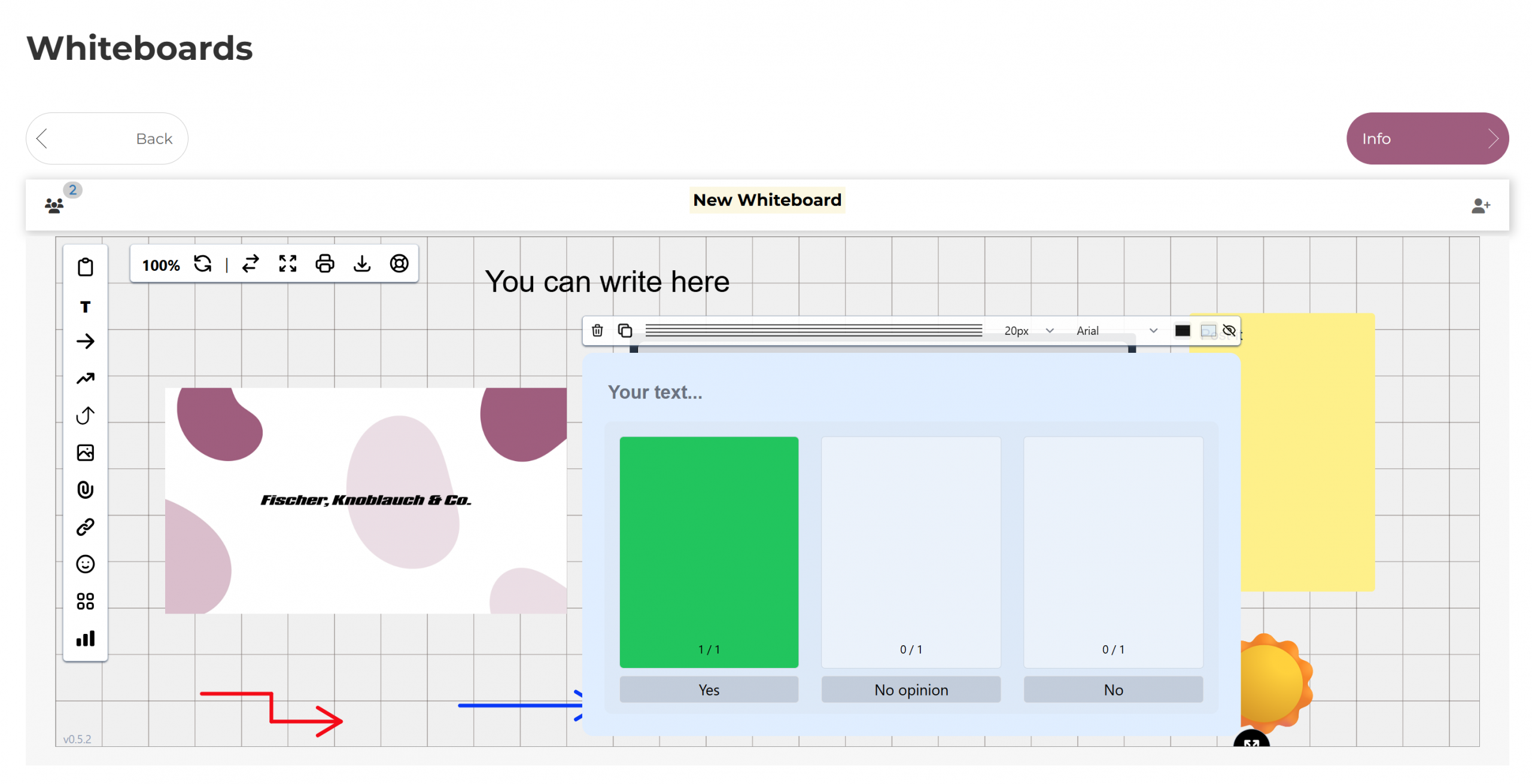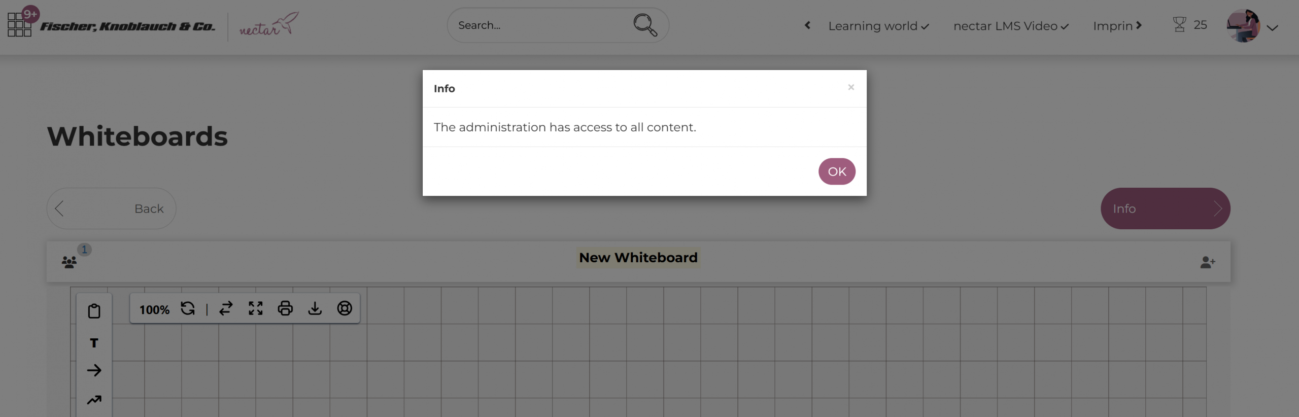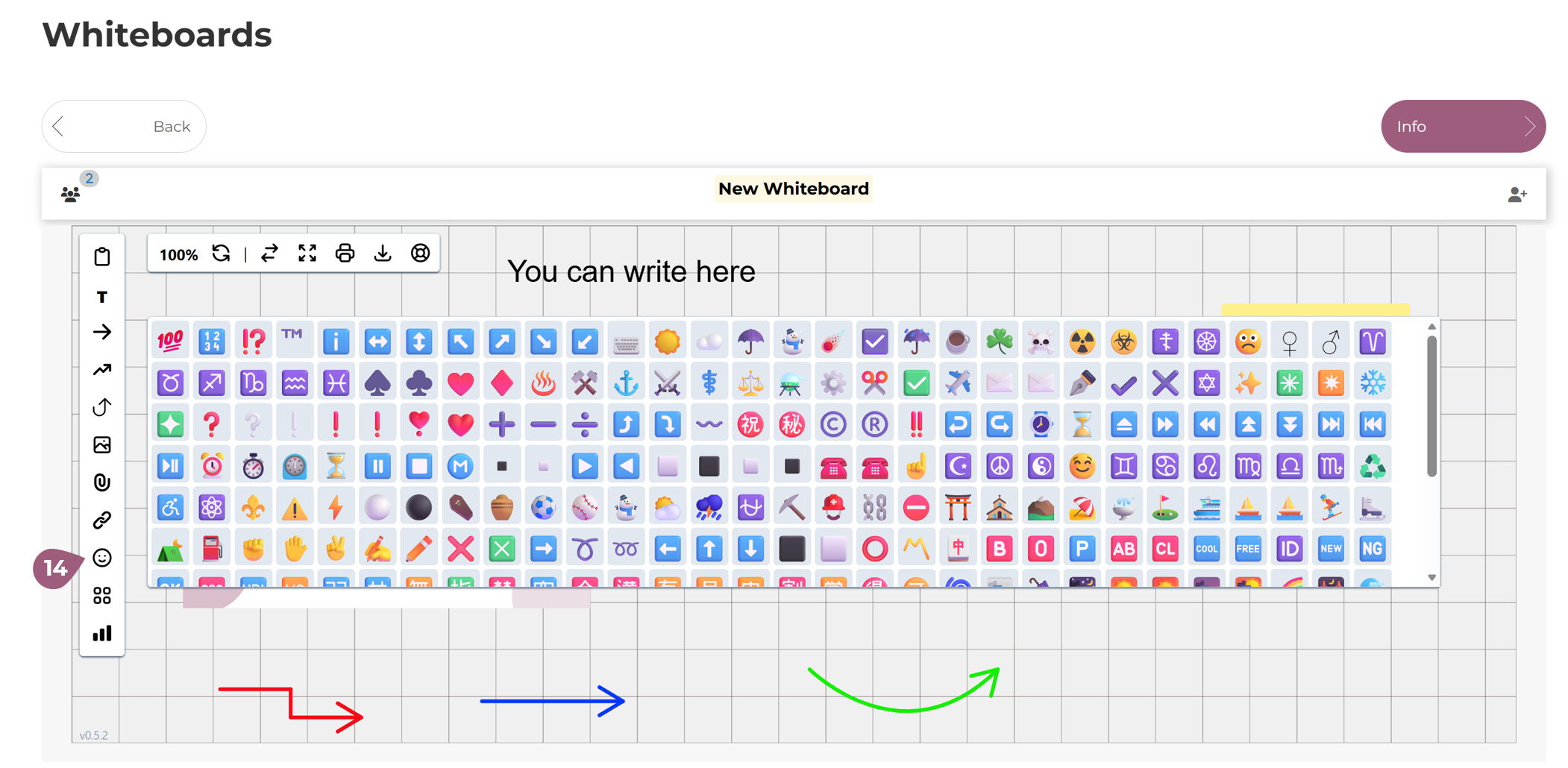 (5) Whiteboard information: The “Info” button provides further information on managing the whiteboard: