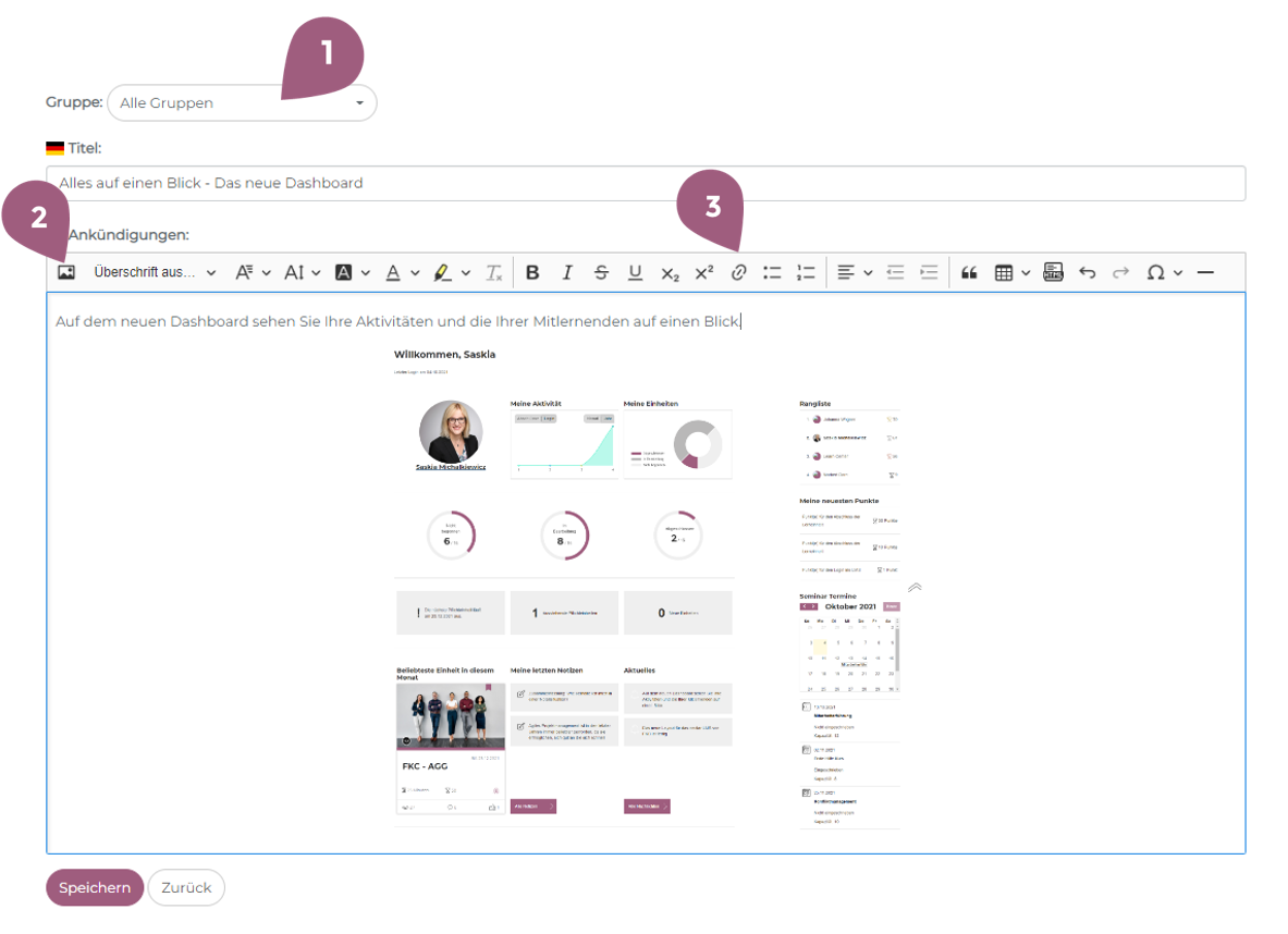 • Wählen Sie die Gruppe aus, für die der Artikel im Lernerbereich zu sehen sein soll (1).