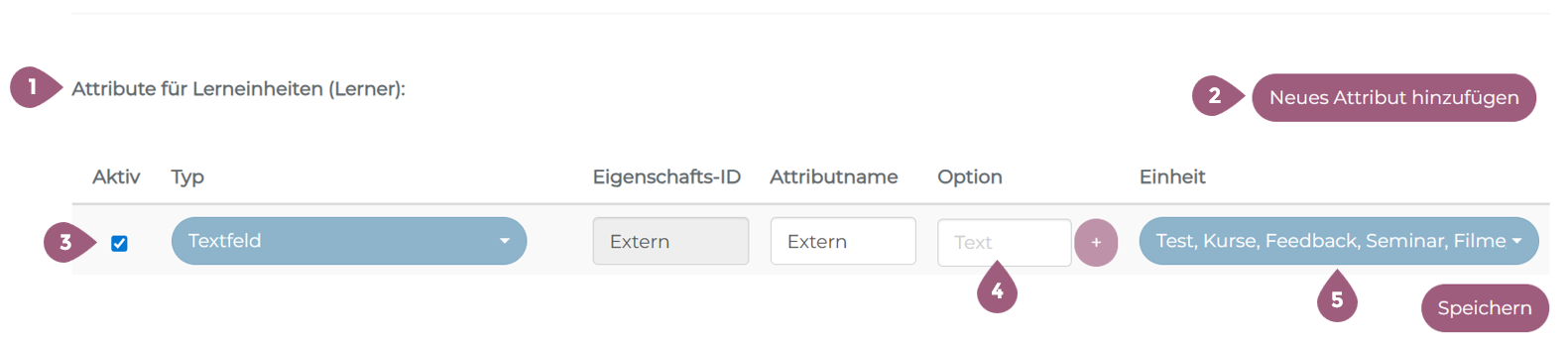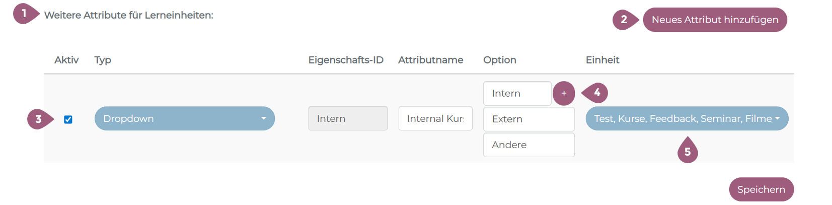 Abschließend muss ausgewählt werden, bei welchen Lerneinheiten das Attribut erscheinen soll (5). Eine Mehrfachauswahl ist hier möglich. Attribute können nicht gelöscht werden.