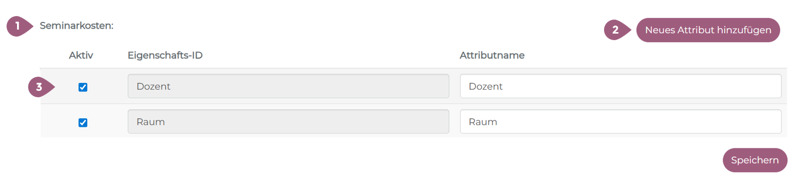 Die dritte Art von Attributen im nectar LMS sind die Seminarkosten (1). Im Gegensatz zu den anderen Attributen betreffen die Kosten ausschließlich Seminare. Auch diese Attribute müssen zunächst hinzugefügt (2) und anschließend aktiviert werden (3).