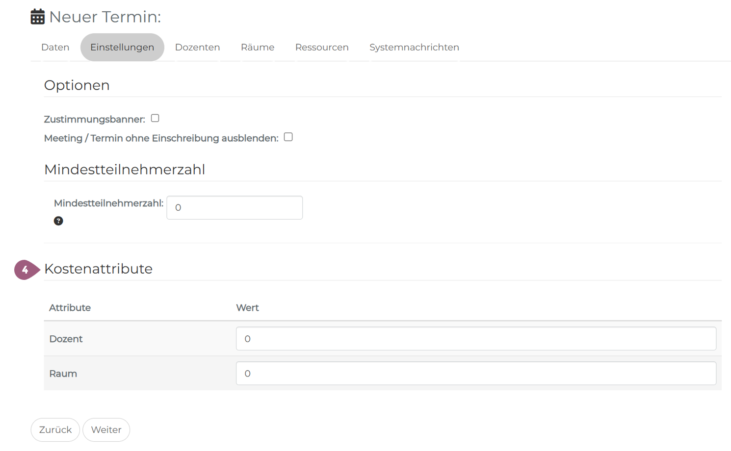 Seminarkosten erscheinen unter „Einstellungen“ in einem Termin. Dort wird ein Textfeld angezeigt, in dem die Kosten eingetragen werden können. Mehr zum Erstellen von Terminen finden Sie hier: Termine erstellen.