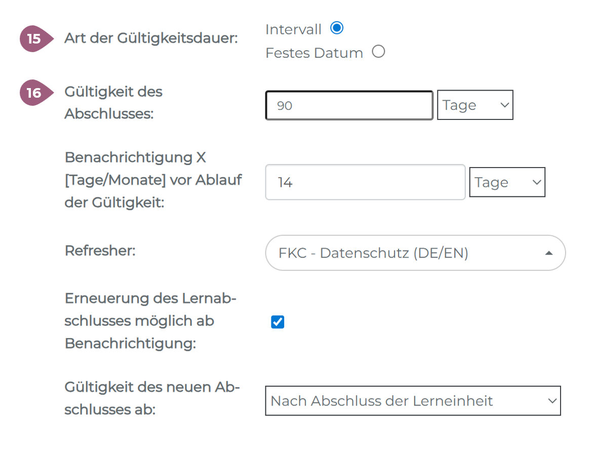 (15) Die Art der Gültigkeitsdauer legt fest, wann die Gültigkeit des Abschlusses der Lerneinheit abläuft. Wenn “Intervall” aktiviert wird, läuft der Abschluss X Tage nach dem Tag ab, an dem die Lerneinheit abgeschlossen wurde. Wenn “Festes Datum” aktiviert wird, läuft der Abschluss der Lerneinheit an den angegeben Datum ab.