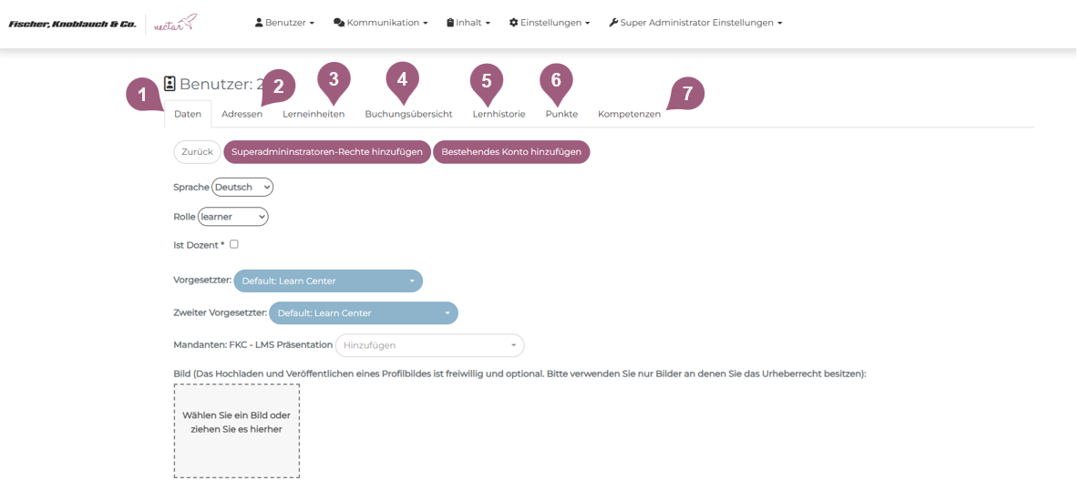 Im Editiermodus der Benutzer finden sich zudem noch die Reiter „Buchungsübersicht” (4) und „Lernhistorie” (5) für weitere Übersichten. An beiden Stellen können Zertifikate hinzugefügt werden, beispielsweise nach dem Besuch eines externen Trainings.
