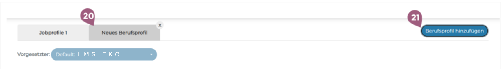 Zusätzlich ist es möglich, mehrere Jobprofile (20) über „Berufsprofile hinzufügen“ (21) zu hinterlegen. Diese Funktion lässt sich über Super Administrator Einstellungen > Systemkonfiguration > Kontoduplikation aktivieren einschalten. Jedes Jobprofil kann einen eigenen Namen, Vorgesetzten usw. enthalten. Die Benutzereigenschaften des Jobprofiles können unter Super Administrator Einstellungen > Benutzereigenschaften angepasst werden.