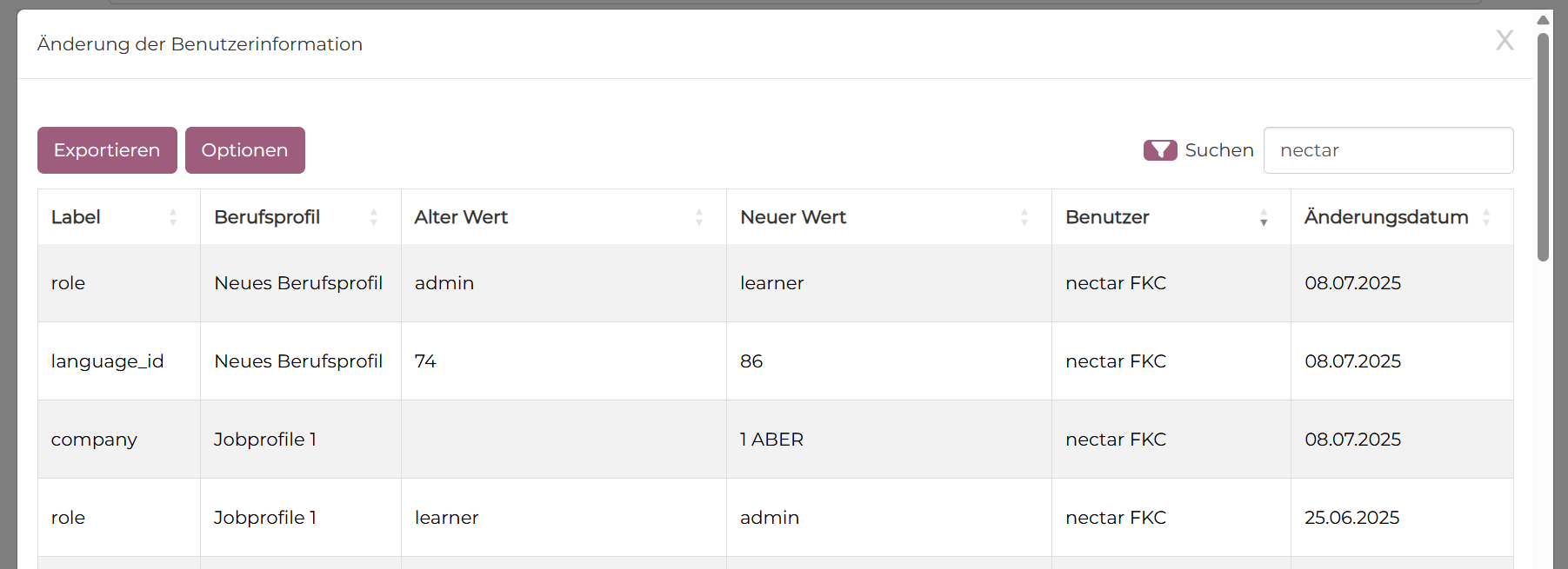 Es ist jederzeit möglich, die Änderungen innerhalb eines Benutzerprofils mit einem Klick auf die Schaltfläche „Info“ nachzuverfolgen (22).