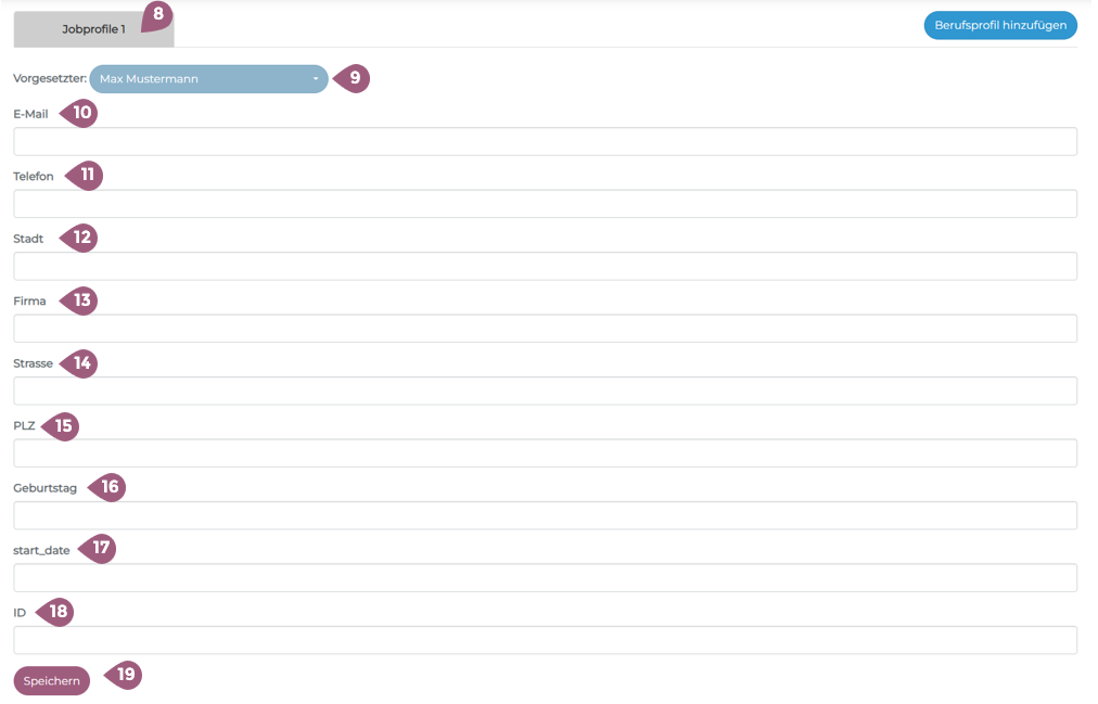 Im Reiter „Daten“ (1) können Sie das Jobprofil (8) einsehen. Jedes Profil lässt sich bei Bedarf umbenennen. Im Jobprofil kann ein Vorgesetzter (9) hinterlegt werden. Ein zweiter Vorgesetzter kann über Einstellungen > Konfiguration > Zweiter Vorgesetzter aktiviert werden.