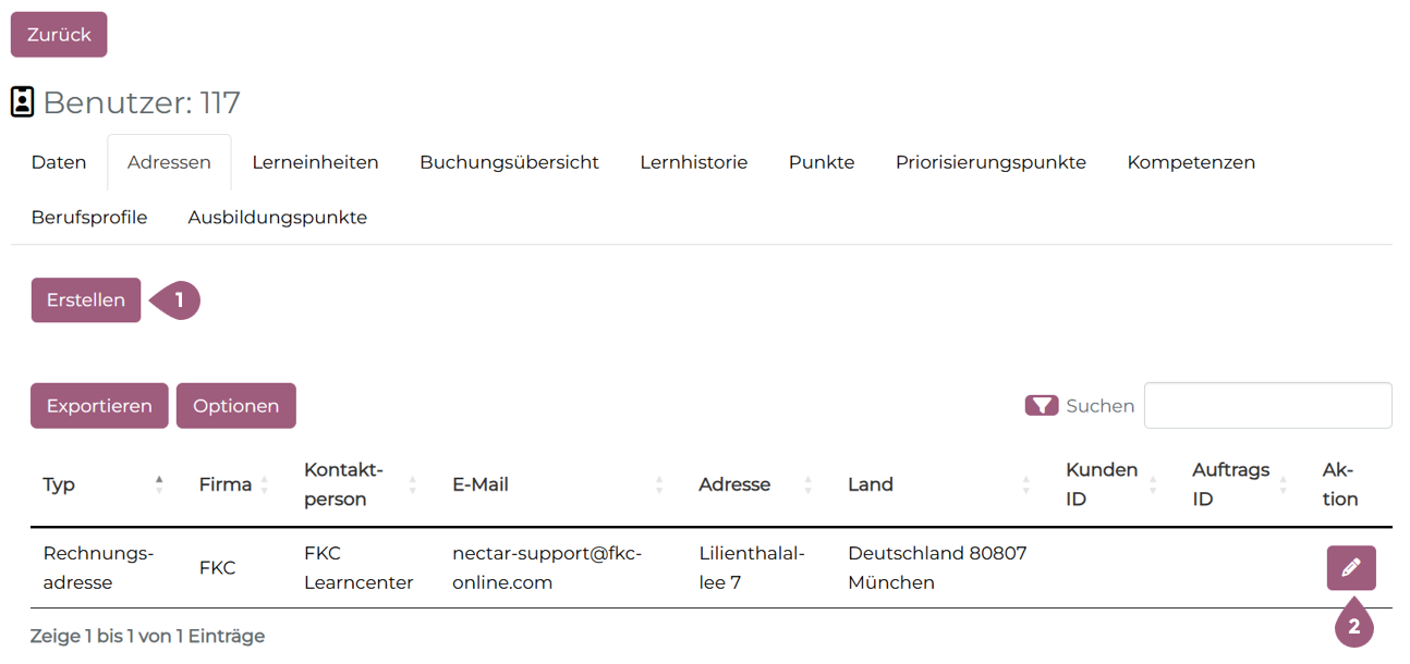 Unter dem Reiter „Adressen“ finden Sie alle Adressen des Benutzers. Dabei kann es sich um Rechnungsadressen oder persönliche Adressen handeln. Mit einem Klick auf „Erstellen“ (1) können Sie eine neue Adresse hinzufügen. Über das Bleistift-Symbol (2) können Sie eine bestehende Adresse bearbeiten.